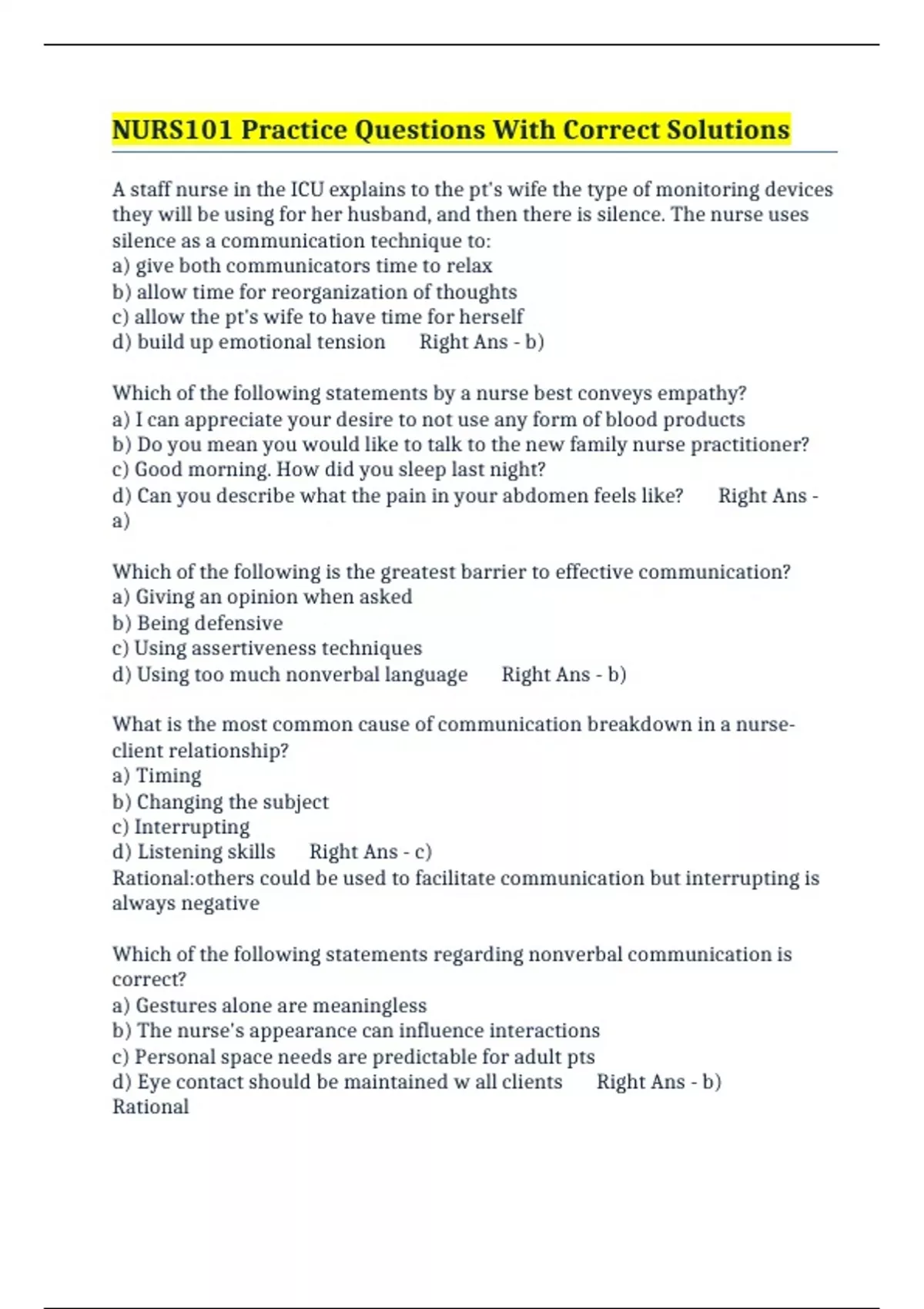NURS101 Practice Questions With Correct Solutions
