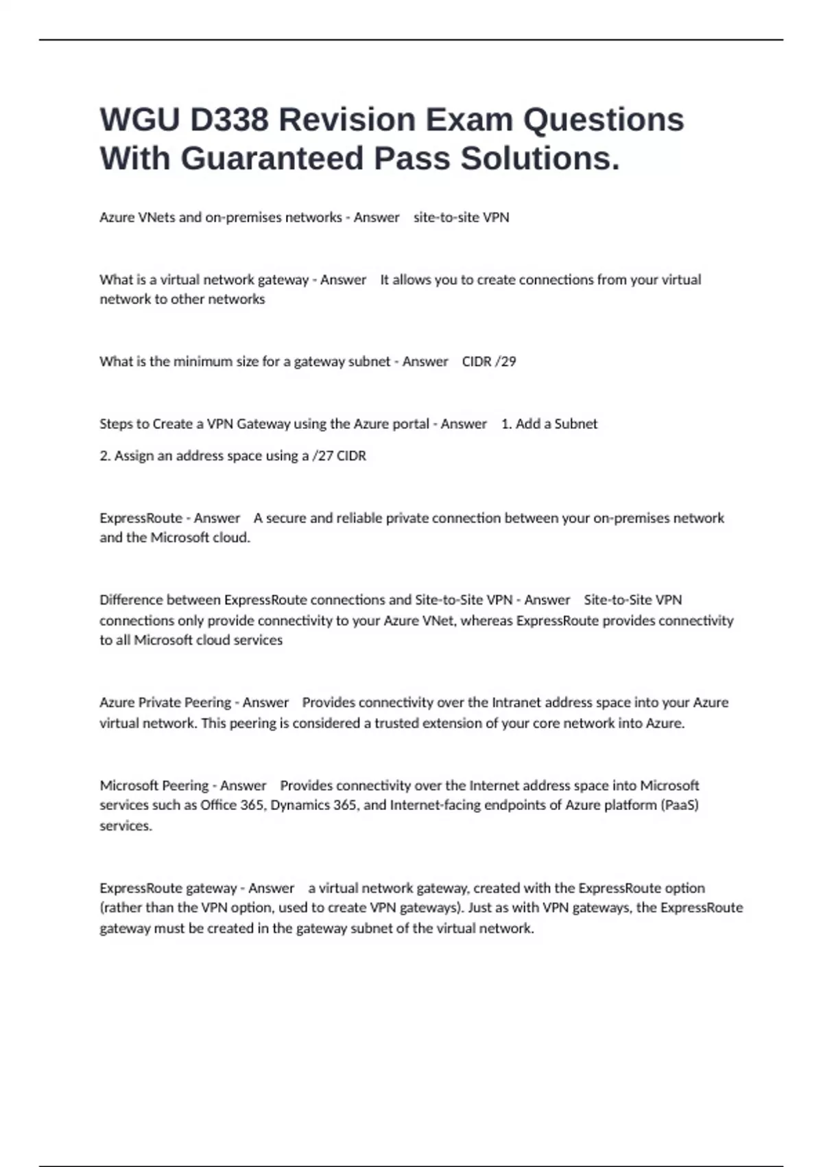 Azure VNets and on-premises networks - Answer site-to-site VPN What is a virtual network gateway - Answer It allows you to create connections from your virtual network to other networks What is the minimum size for a gateway subnet - Answer CIDR /29 Steps to Create a VPN Gateway using the Azure portal - Answer 1. Add a Subnet 2. Assign an address space using a /27 CIDR ExpressRoute - Answer A secure and reliable private connection between your on-premises network and the Microsoft cloud. Difference between ExpressRoute connections and Site-to-Site VPN - Answer Site-to-Site VPN connections only provide connectivity to your Azure VNet, whereas ExpressRoute provides connectivity to all Microsoft cloud services Azure Private Peering - Answer Provides connectivity over the Intranet address space into your Azure virtual network. This peering is considered a trusted extension of your core network into Azure. Microsoft Peering - Answer Provides connectivity over the Internet address space into Microsoft services such as Office 365, Dynamics 365, and Internet-facing endpoints of Azure platform (PaaS) services. ExpressRoute gateway - Answer a virtual network gateway, created with the ExpressRoute option (rather than the VPN option, used to create VPN gateways). Just as with VPN gateways, the ExpressRoute gateway must be created in the gateway subnet of the virtual network.