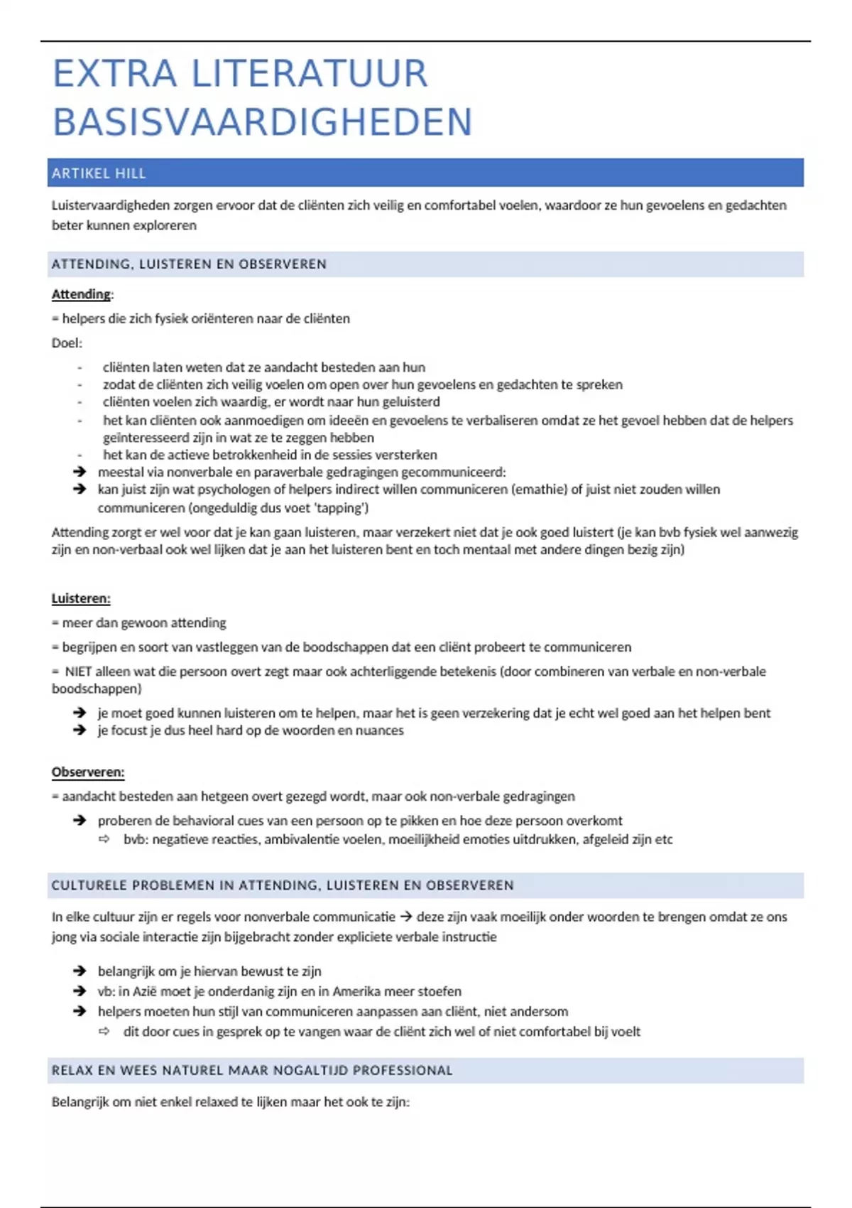 Dit document is een samenvatting van de verplichte literatuur voor het vak Psychologische basisvaardigheden voor gesprek en begeleiding (3de bachelor psychologie). De artikels die hierin vertaald (naar het Nederlands) en samengevat zijn: eerste tekst van Hill over luisteren, het artikel van Hill over self-awaraness en het artikel over "Ethical Issues".