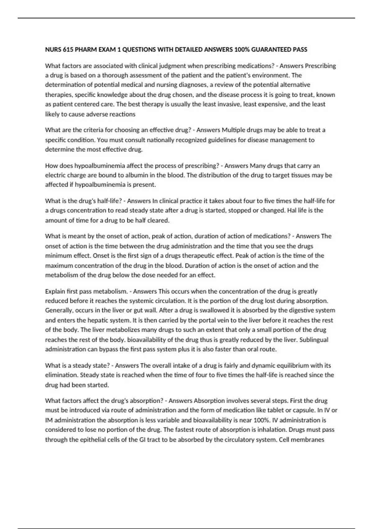 NURS 615 PHARM EXAM 1 QUESTIONS WITH DETAILED ANSWERS 100% GUARANTEED PASS What factors are associated with clinical judgment when prescribing medications? - Answers Prescribing a drug is based on a thorough assessment of the patient and the patient's environment. The determination of potential medical and nursing diagnoses, a review of the potential alternative therapies, specific knowledge about the drug chosen, and the disease process it is going to treat, known as patient centered care. The best therapy is usually the least invasive, least expensive, and the least likely to cause adverse reactions What are the criteria for choosing an effective drug? - Answers Multiple drugs may be able to treat a specific condition. You must consult nationally recognized guidelines for disease management to determine the most effective drug. How does hypoalbuminemia affect the process of prescribing? - Answers Many drugs that carry an electric charge are bound to albumin in the blood. The distribution of the drug to target tissues may be affected if hypoalbuminemia is present. What is the drug's half-life? - Answers In clinical practice it takes about four to five times the half-life for a drugs concentration to read steady state after a drug is started, stopped or changed. Hal life is the amount of time for a drug to be half cleared. What is meant by the onset of action, peak of action, duration of action of medications? - Answers The onset of action is the time between the drug administration and the time that you see the drugs minimum effect. Onset is the first sign of a drugs therapeutic effect. Peak of action is the time of the maximum concentration of the drug in the blood. Duration of action is the onset of action and the metabolism of the drug below the dose needed for an effect. Explain first pass metabolism. - Answers This occurs when the concentration of the drug is greatly reduced before it reaches the systemic circulation. It is the portion of the drug lost during absorption. Generally, occurs in the liver or gut wall. After a drug is swallowed it is absorbed by the digestive system and enters the hepatic system. It is then carried by the portal vein to the liver before it reaches the rest of the body. The liver metabolizes many drugs to such an extent that only a small portion of the drug reaches the rest of the body. bioavailability of the drug thus is greatly reduced by the liver. Sublingual administration can bypass the first pass system plus it is also faster than oral route. What is a steady state? - Answers The overall intake of a drug is fairly and dynamic equilibrium with its elimination. Steady state is reached when the time of four to five times the half-life is reached since the drug had been started. What factors affect the drug's absorption? - Answers Absorption involves several steps. First the drug must be introduced via route of administration and the form of medication like tablet or capsule. In IV or IM administration the absorption is less variable and bioavailability is near 100%. IV administration is considered to lose no portion of the drug. The fastest route of absorption is inhalation. Drugs must pass through the epithelial cells of the GI tract to be absorbed by the circulatory system. Cell membranes may affect the absorption of some drugs because they are made of lipid bilayers that are semi permeable. This means only small uncharged solutes can pass through the membrane. Whether or not a molecule is ionized affects the absorption, since ionic molecules are charged. Solubility favors charged species. Permeability favors neutral species. Some molecules have special channels to facilitate movement from the lumen into the circulation. The Henderson Hasselbeck equation offers a way to determine the portion that is ionized in a given pH. Weak acids will be present in their nonionic form in the stomach because of the acidic pH and bases will be in their ionic form. Nonionic species diffuse easier through cell membranes. Weak acids have a higher absorption rate in the stomach. The opposite is true in the basic environment of the stomach. Identify drug metabolism and the role of the isoenzymes of the P450 system. - Answers CYPs are the major enzymes in drug metabolism. Must drugs undergo deactivation by CYPs are directly facilitated secretion from the body. Many substances are bioactivated by CYPs to form their active compound. Many drugs increase or decrease the activity of CYPs isoenzymes either by inducing biosynthesis of an isozyme, which is enzyme induction or by directly inhibiting the activity of CYP which is enzyme inhibition. This is a major source of adverse drug reactions since changes in CYPs activity may affect the metabolism and clearance of certain drugs. When two drugs are both metabolized by the CYP450 system the drugs should be administered at separate times to prevent toxic effects. What is the efficacy of the drug? - Answers Efficacy is the maximum response achievable from a drug. Intrinsic activity is a term used to describe the efficacy of a drug relative to a drugs highest observed efficacy. Effectiveness refers to the ability of a drug to produce the wanted effect. On the drug concentration curve what is the first sign of a therapeutic effect? - Answers The onset of action. What is the purpose of a peak and trough level? - Answers To determine if the drug is within therapeutic range. Which is either dosage range or blood plasma or serum concentration usually expected to affect desired effects. Some patients require doses or concentrations above or below this range and some patients have toxicity within this range. Describe the purpose of the blood brain barrier and the fetal placental barrier. - Answers The blood brain barrier is a highly selective permeability barrier that separates circulating blood fro