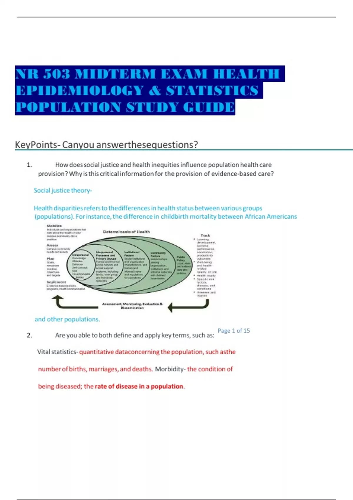 NR 503 MIDTERM EXAM HEALTH EPIDEMIOLOGY & STATISTICS POPULATION STUDY GUIDE Key Points- Can you answer these questions? 1. How do social justice and health inequities influence population health care provision? Why is this critical information for the provision of evidence-based care? Social justice theory- Health disparities refer to the differences in health status between various groups (populations). For instance, the difference in childbirth mortality between African Americans