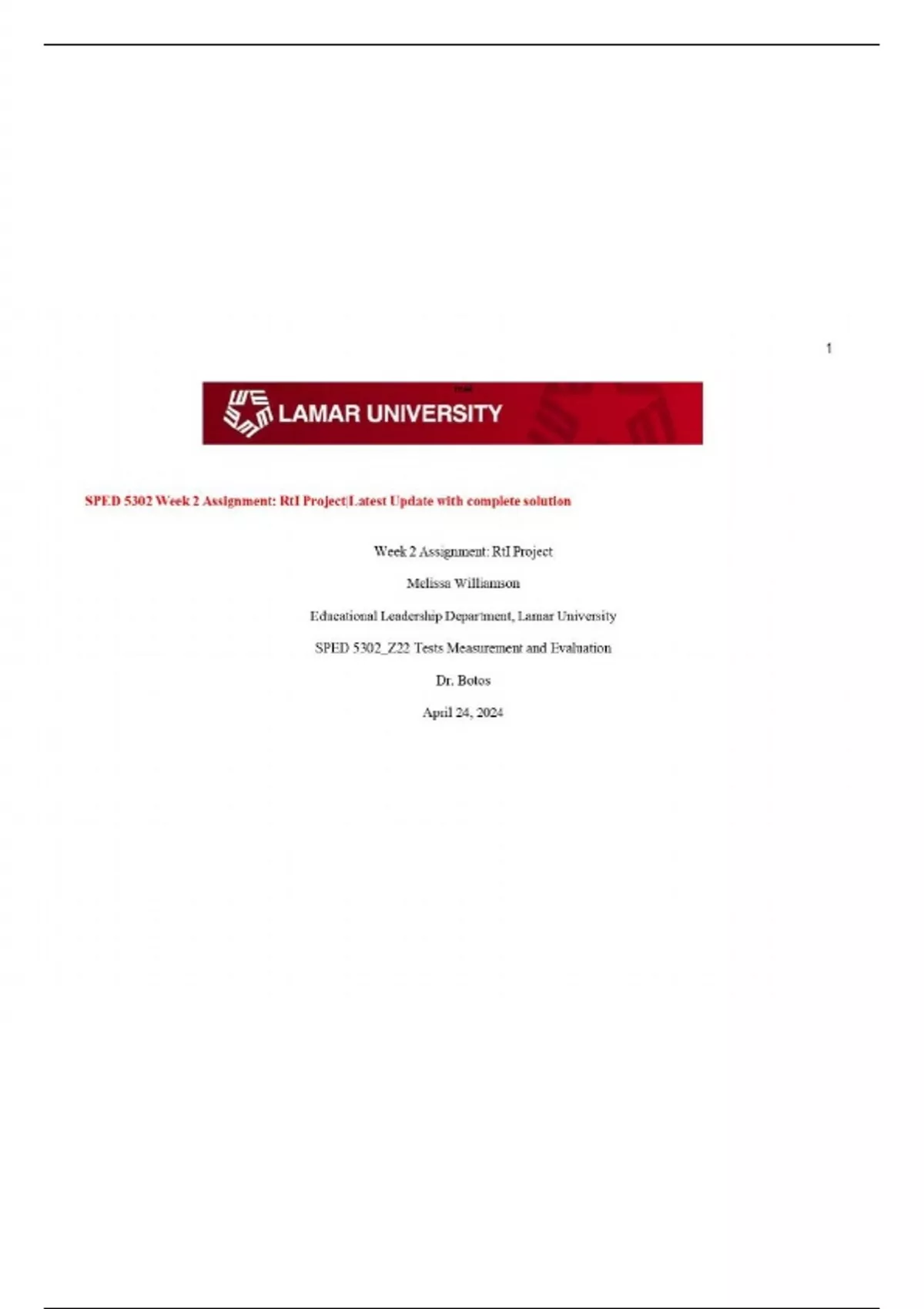 SPED 5302 Week 2 Assignment: RtI Project|Latest Update with complete solution