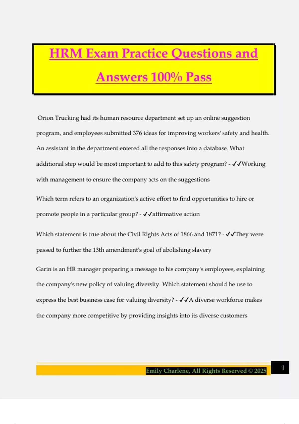 HRM Exam Practice Questions and Answers 100% Pass Orion Trucking had its human resource department set up an online suggestion program, and employees submitted 376 ideas for improving workers' safety and health. An assistant in the department entered all the responses into a database. What additional step would be most important to add to this safety program? - Working with management to ensure the company acts on the suggestions Which term refers to an organization's active effort to find opportunities to hire or promote people in a particular group? - affirmative action Which statement is true about the Civil Rights Acts of 1866 and 1871? - They were passed to further the 13th amendment's goal of abolishing slavery Garin is an HR manager preparing a message to his company's employees, explaining the company's new policy of valuing diversity. Which statement should he use to express the best business case for valuing diversity? - A diverse workforce makes the company more competitive by providing insights into its diverse customers 2Emily Charlene, All Rights Reserved © 2025 Identify the type of case where most of the debate focuses on discriminatory consequences and the plaintiff need not prove an employer's intent to discriminate - Disparate Impact Tyler has joined a start-up manufacturing company as its human resource manager. One of his first responsibilities is to make sure the company complies with the OSH Act. Under this law, what records must Tyler keep? - Work-related injuries and illnesses, with an annual summary of these Identify the method that breaks down jobs into basic elements to rate them for their potential for harm or injury. - Job hazard analysis technique Differing conduct toward individuals, where the differences are clearly based on the individuals' race, color, religion, sex, national origin, age, or disability status is termed as - Disparate treatment Identify the correct statement regarding reasonable accommodation. - Reasonable accommodation is typically provided in situations involving individuals with disabilities or different religious needs Identify the correct statement regarding the Occupation Safety and Health Act - If an OSH Act violation results in citations, an employer must post