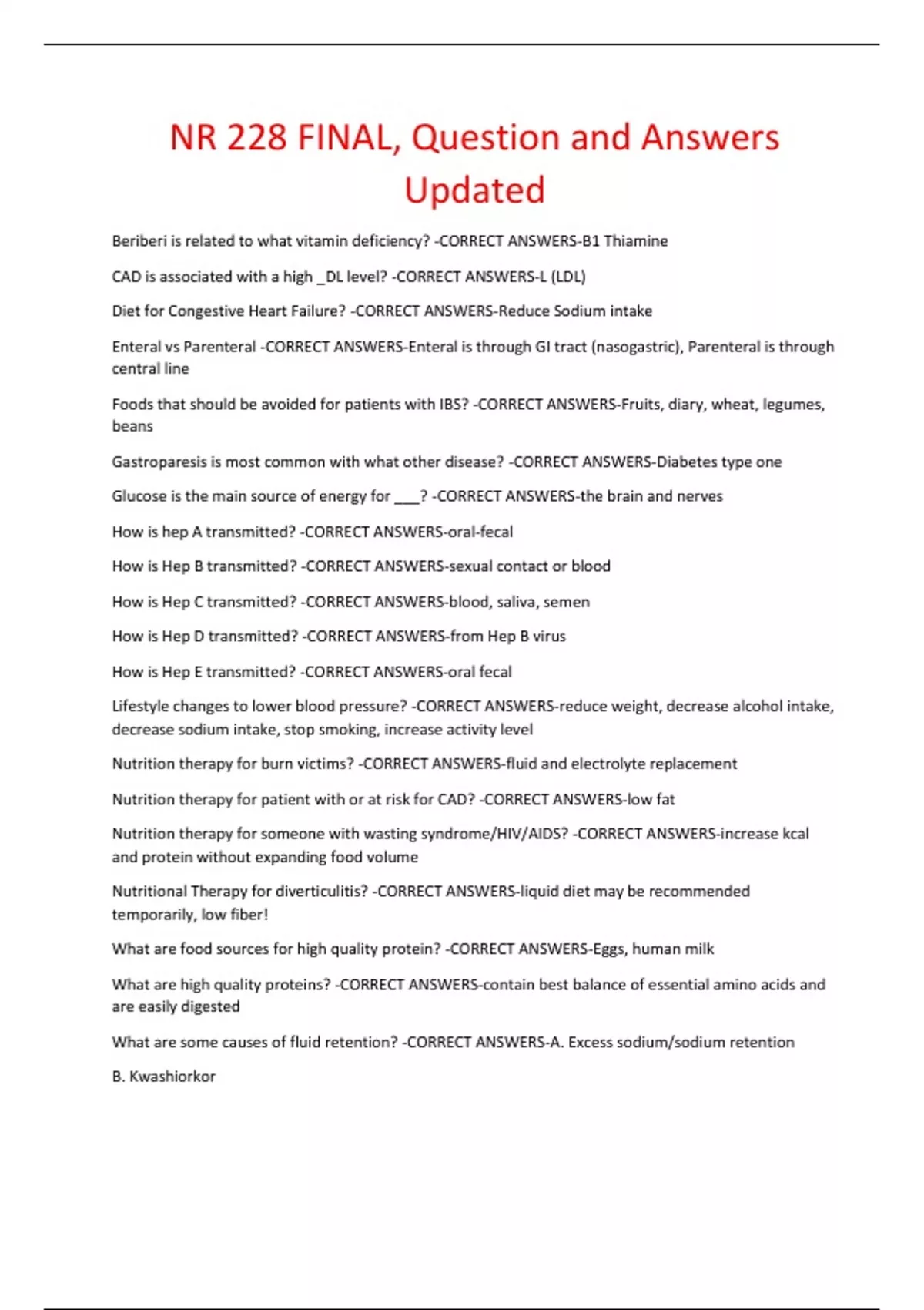 NR 228 FINAL, Question and Answers Updated Beriberi is related to what vitamin deficiency? -CORRECT ANSWERS-B1 Thiamine CAD is associated with a high _DL level? -CORRECT ANSWERS-L (LDL) Diet for Congestive Heart Failure? -CORRECT ANSWERS-Reduce Sodium intake Enteral vs Parenteral -CORRECT ANSWERS-Enteral is through GI tract (nasogastric), Parenteral is through central line Foods that should be avoided for patients with IBS? -CORRECT ANSWERS-Fruits, diary, wheat, legumes, beans Gastroparesis is most common with what other disease? -CORRECT ANSWERS-Diabetes type one Glucose is the main source of energy for ___? -CORRECT ANSWERS-the brain and nerves How is hep A transmitted? -CORRECT ANSWERS-oral-fecal How is Hep B transmitted? -CORRECT ANSWERS-sexual contact or blood How is Hep C transmitted? -CORRECT ANSWERS-blood, saliva, semen How is Hep D transmitted? -CORRECT ANSWERS-from Hep B virus How is Hep E transmitted? -CORRECT ANSWERS-oral fecal Lifestyle changes to lower blood pressure? -CORRECT ANSWERS-reduce weight, decrease alcohol intake, decrease sodium intake, stop smoking, increase activity level Nutrition therapy for burn victims? -CORRECT ANSWERS-fluid and electrolyte replacement Nutrition therapy for patient with or at risk for CAD? -CORRECT ANSWERS-low fat Nutrition therapy for someone with wasting syndrome/HIV/AIDS? -CORRECT ANSWERS-increase kcal and protein without expanding food volume Nutritional Therapy for diverticulitis? -CORRECT ANSWERS-liquid diet may be recommended temporarily, low fiber! What are food sources for high quality protein? -CORRECT ANSWERS-Eggs, human milk What are high quality proteins? -CORRECT ANSWERS-contain best balance of essential amino acids and are easily digested What are some causes of fluid retention? -CORRECT ANSWERS-A. Excess sodium/sodium retention B. Kwashiorkor C. Water intoxication What are some clinical manifestations of vitamin B12 deficiency? -CORRECT ANSWERS-pernicious anemia and CNS damage What are some food sources for complete proteins? (select all that apply). A. Meats B. Dark green veggies C. Eggs D. Dairy products E. Fruits -CORRECT ANSWERS-A, C, D What are some food sources for Folate? -CORRECT ANSWERS-leafy green veggies, legumes, fortified grain cereals What are some food sources for monounsaturated fatty acids? -CORRECT ANSWERS-olive oil, peanuts, avocado, canola oil What are some food sources for polyunsaturated fatty acids? -CORRECT ANSWERS-vegetable oils, fish, margarine, What are some food sources for Vitamin D? -CORRECT ANSWERS-animal related foods (butter, egg, liver) What are some food sources of B1 Thiamine? -CORRECT ANSWERS-lean pork, whole grains and flours, legumes, seeds and nuts What are some incomplete proteins? -CORRECT ANSWERS-plant foods What are some modifiable risk factors for CAD? -CORRECT ANSWERS-hypertension, smoking, type two diabetes, obesity, diet, steroids What are some possible complications of Iodine Deficiency? -CORRECT ANSWERS-Cretinism in pregnancy, goiter What are some symptoms of hepatic encephalopathy? -CORRECT ANSWERS-confusion, change in LOC, behavior changes, personality changes What are some ways to treat GERD? A. Lay down after meals B. Avoid big meals C. Avoid tight clothing D. Avoid high fat foods E. Eat chocolate to ease stomach -CORRECT ANSWERS-B, C, D What are the fat soluble vitamins? -CORRECT ANSWERS-A, D, E, K What can cause a sodium deficiency? (select all that apply) A. Dehydration B. Hypernatremia C. Diarrhea D. Liver Disease -CORRECT ANSWERS-A. Dehydration C. Diarrhea What complications are related to gestational diabetes? (select all that apply) A. premature birth B. congenital abnormalities C. fetal death D. type 2 diabetes later in mother E. macrosomia -CORRECT ANSWERS-A. premature birth