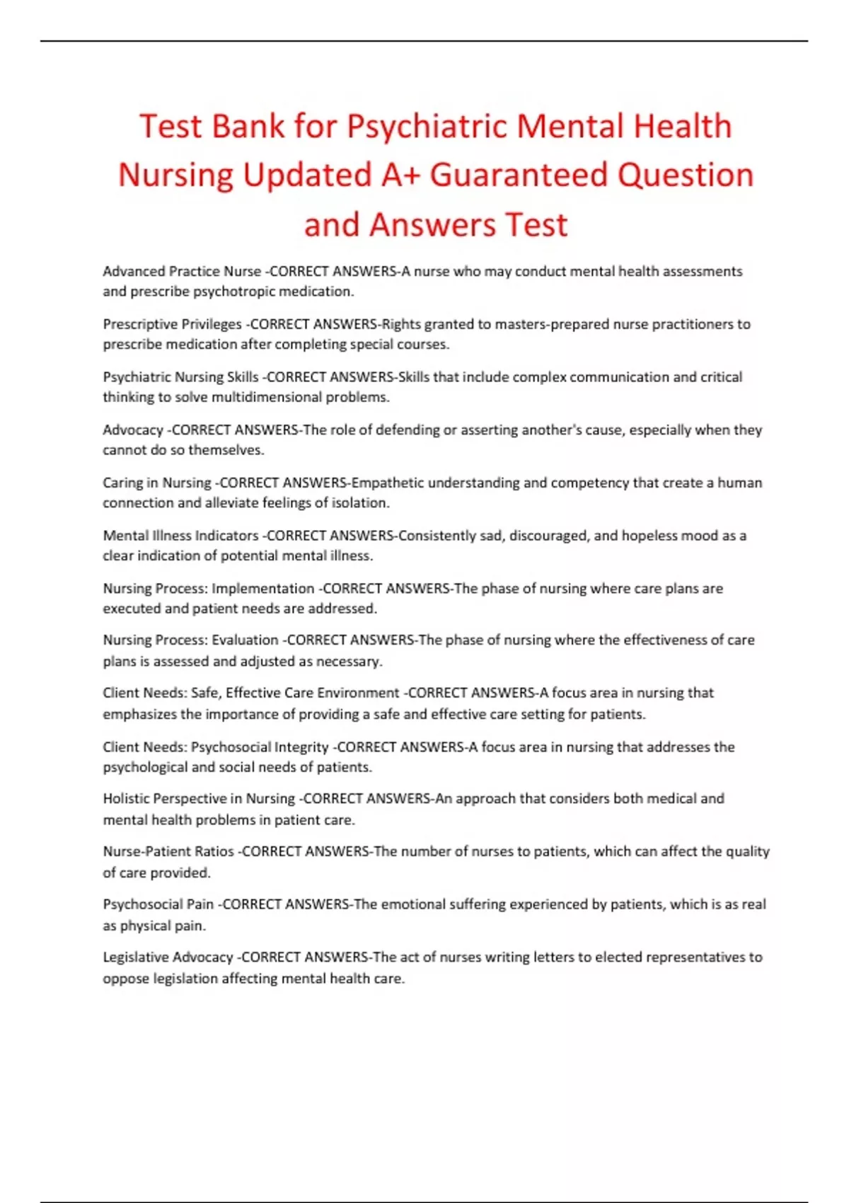 Client Needs: Psychosocial Integrity -CORRECT ANSWERS-A focus area in nursing that addresses the