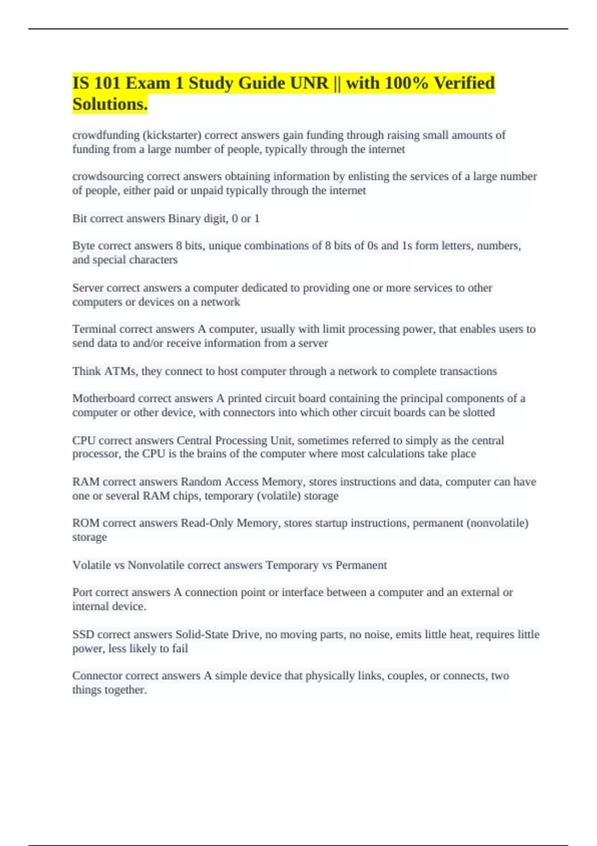 SSD correct answers Solid-State Drive, no moving parts, no noise, emits little heat, requires little