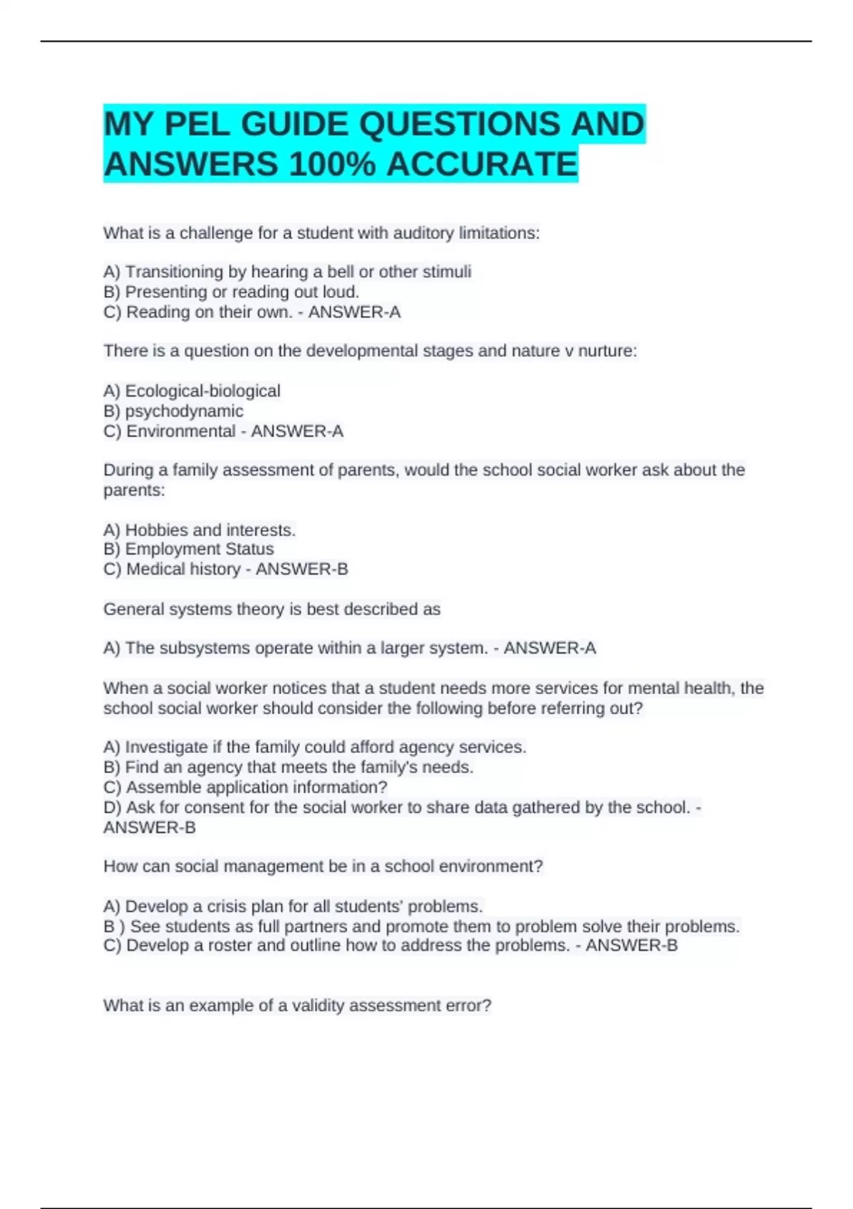 MY PEL GUIDE QUESTIONS AND ANSWERS 100% ACCURATE MY PEL GUIDE QUESTIONS AND ANSWERS 100% ACCURATE MY PEL GUIDE QUESTIONS AND ANSWERS 100% ACCURATE What is a challenge for a student with auditory limitations: A) Transitioning by hearing a bell or other stimuli B) Presenting or reading out loud. C) Reading on their own. - ANSWER-A There is a question on the developmental stages and nature v nurture: A) Ecological-biological B) psychodynamic C) Environmental - ANSWER-A During a family assessment of parents, would the school social worker ask about the parents: A) Hobbies and interests. B) Employment Status C) Medical history - ANSWER-B General systems theory is best described as A) The subsystems operate within a larger system. - ANSWER-A When a social worker notices that a student needs more services for mental health, the school social worker should consider the following before referring out?