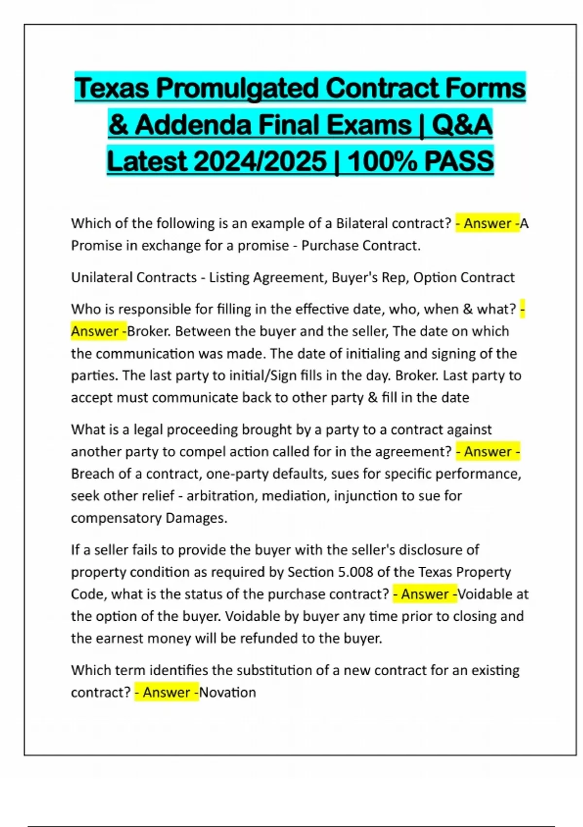 Texas Promulgated Contract Forms & Addenda Final Exams | Q&A Latest 2024/2025 | 100% PASS Which of the following is an example of a Bilateral contract? - Answer -A Promise in exchange for a promise - Purchase Contract. Unilateral Contracts - Listing Agreement, Buyer's Rep, Option Contract Who is responsible for filling in the effective date, who, when & what? - Answer -Broker. Between the buyer and the seller, The date on which the communication was made. The date of initialing and signing of the parties. The last party to initial/Sign fills in the day. Broker. Last party to accept must communicate back to other party & fill in the date What is a legal proceeding brought by a party to a contract against another party to compel action called for in the agreement? - Answer - Breach of a contract, one-party defaults, sues for specific performance, seek other relief - arbitration, mediation, injunction to sue for compensatory Damages. If a seller fails to provide the buyer with the seller's disclosure of property condition as required by Section 5.008 of the Texas Property Code, what is the status of the purchase contract? - Answer -Voidable at the option of the buyer. Voidable by buyer any time prior to closing and the earnest money will be refunded to the buyer. Which term identifies the substitution of a new contract for an existing contract? - Answer -Novation
