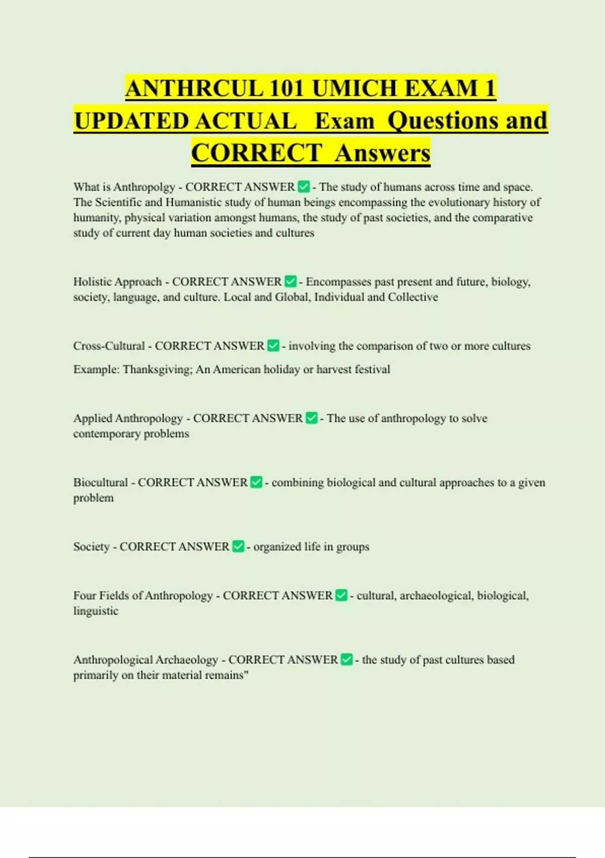 ANTHRCUL 101 UMICH EXAM 1 UPDATED ACTUAL Exam Questions and CORRECT Answers What is Anthropolgy - CORRECT ANSWER - The study of humans across time and space. The Scientific and Humanistic study of human beings encompassing the evolutionary history of humanity, physical variation amongst humans, the s