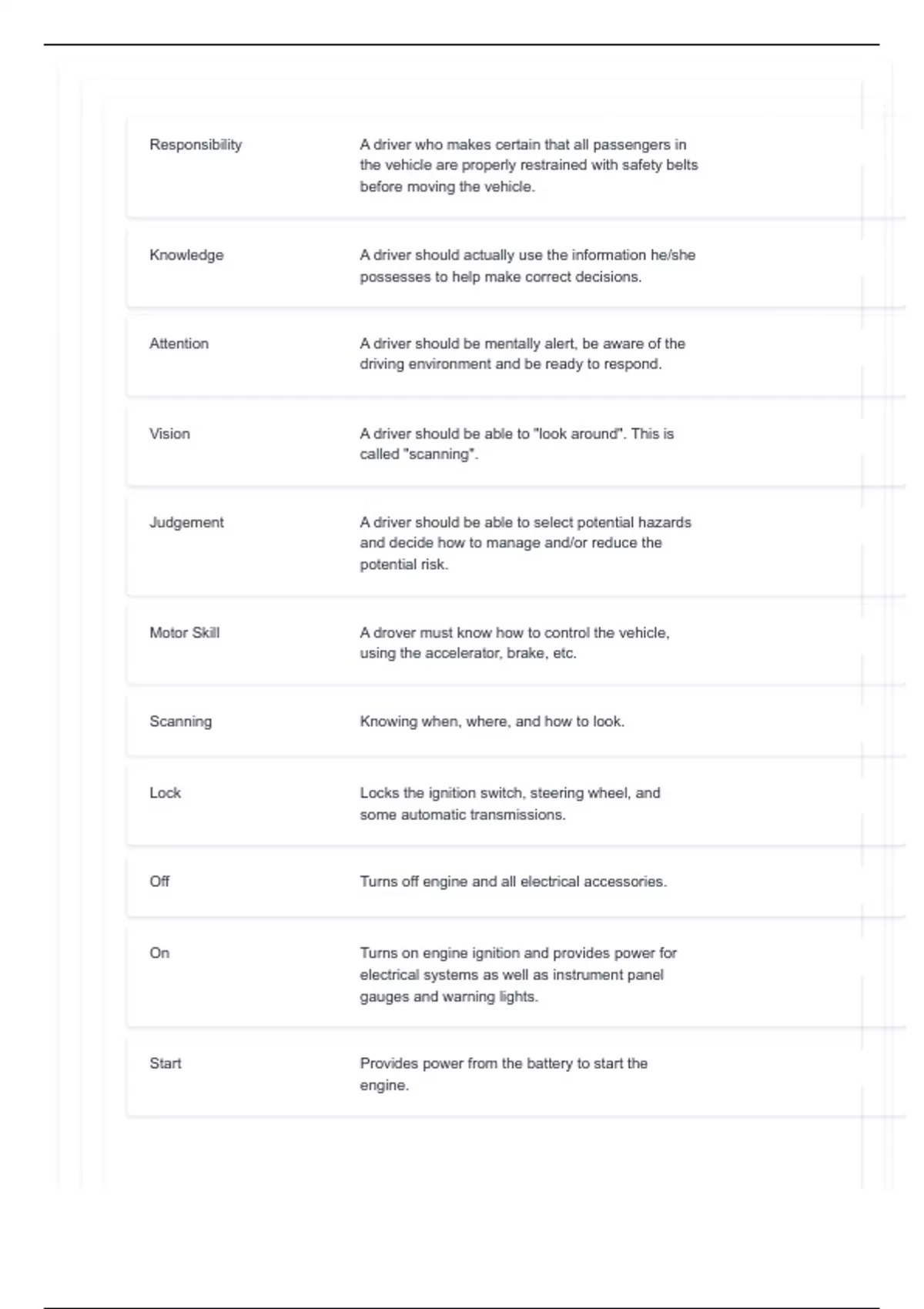 Motor Skill A drover must know how to control the vehicle,