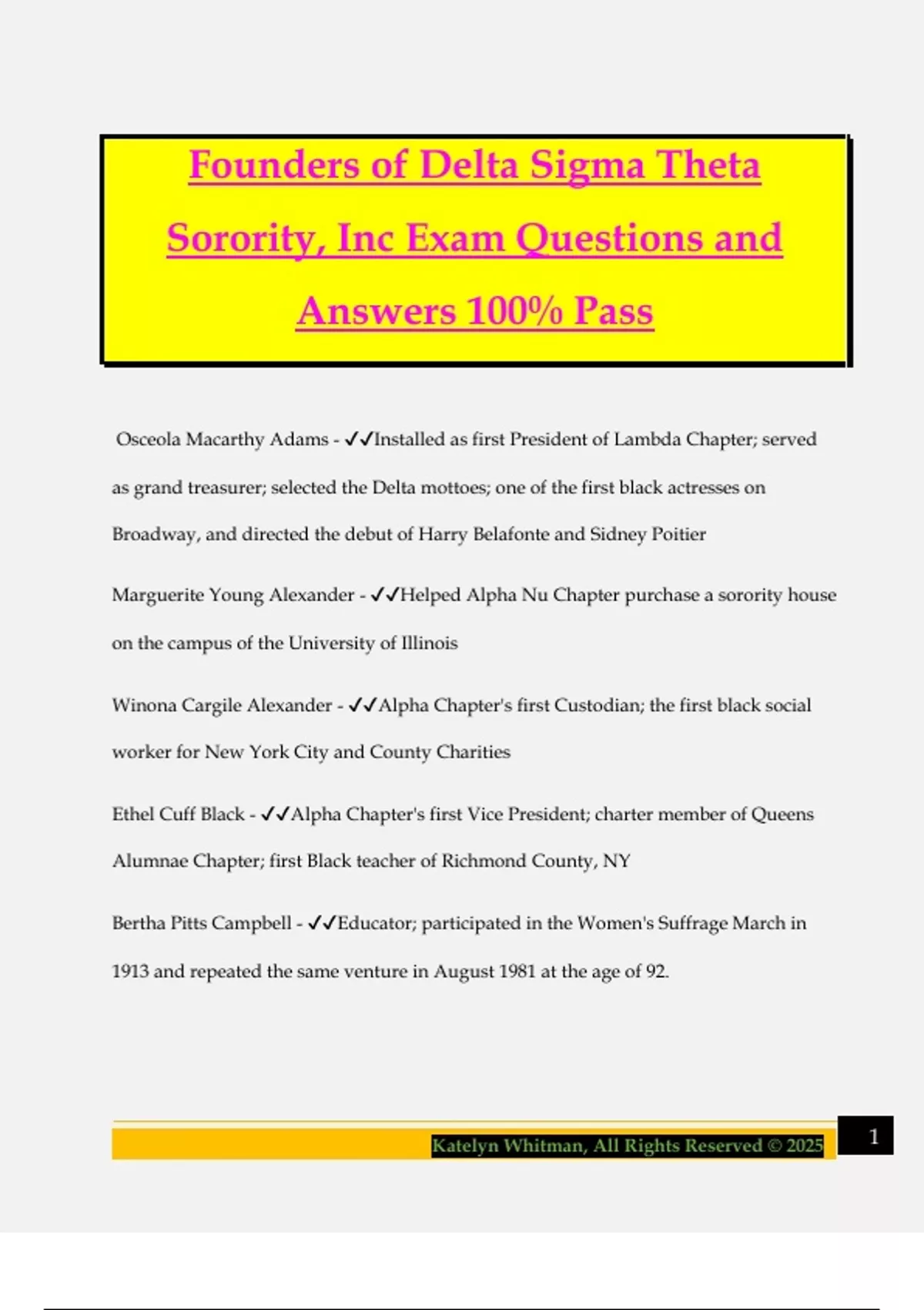 Founders of Delta Sigma Theta Sorority, Inc Exam Questions and Answers 100% Pass Osceola Macarthy Adams - Installed as first President of Lambda Chapter; served as grand treasurer; selected the Delta mottoes; one of the first black actresses on Broadway, and directed the debut of Harry Belafonte and Sidney Poitier Marguerite Young Alexander - Helped Alpha Nu Chapter purchase a sorority house on the campus of the University of Illinois Winona Cargile Alexander - Alpha Chapter's first Custodian; the first black social worker for New York City and County Charities Ethel Cuff Black - Alpha Chapter's first Vice President; charter member of Queens Alumnae Chapter; first Black teacher of Richmond County, NY Bertha Pitts Campbell - Educator; participated in the Women's Suffrage March in 1913 and repeated the same venture in August 1981 at the age of 92.
