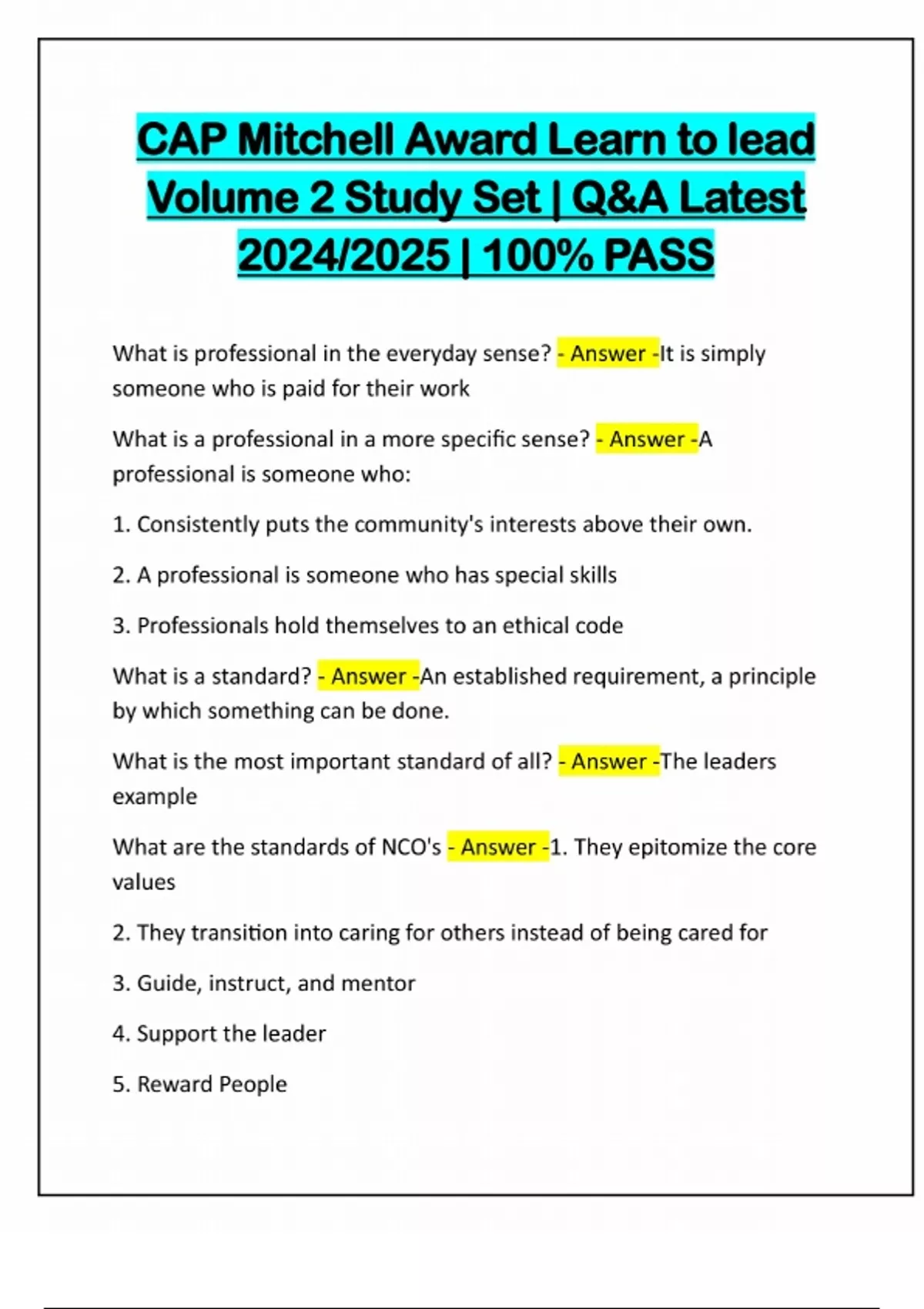 CAP Mitchell Award Learn to lead Volume 2 Study Set | Q&A Latest 2024/2025 | 100% PASS What is professional in the everyday sense? - Answer -It is simply someone who is paid for their work What is a professional in a more specific sense? - Answer -A professional is someone who: 1. Consistently puts the community's interests above their own. 2. A professional is someone who has special skills 3. Professionals hold themselves to an ethical code What is a standard? - Answer -An established requirement, a principle by which something can be done. What is the most important standard of all? - Answer -The leaders example What are the standards of NCO's - Answer -1. They epitomize the core values 2. They transition into caring for others instead of being cared for 3. Guide, instruct, and mentor 4. Support the leader 5. Reward People