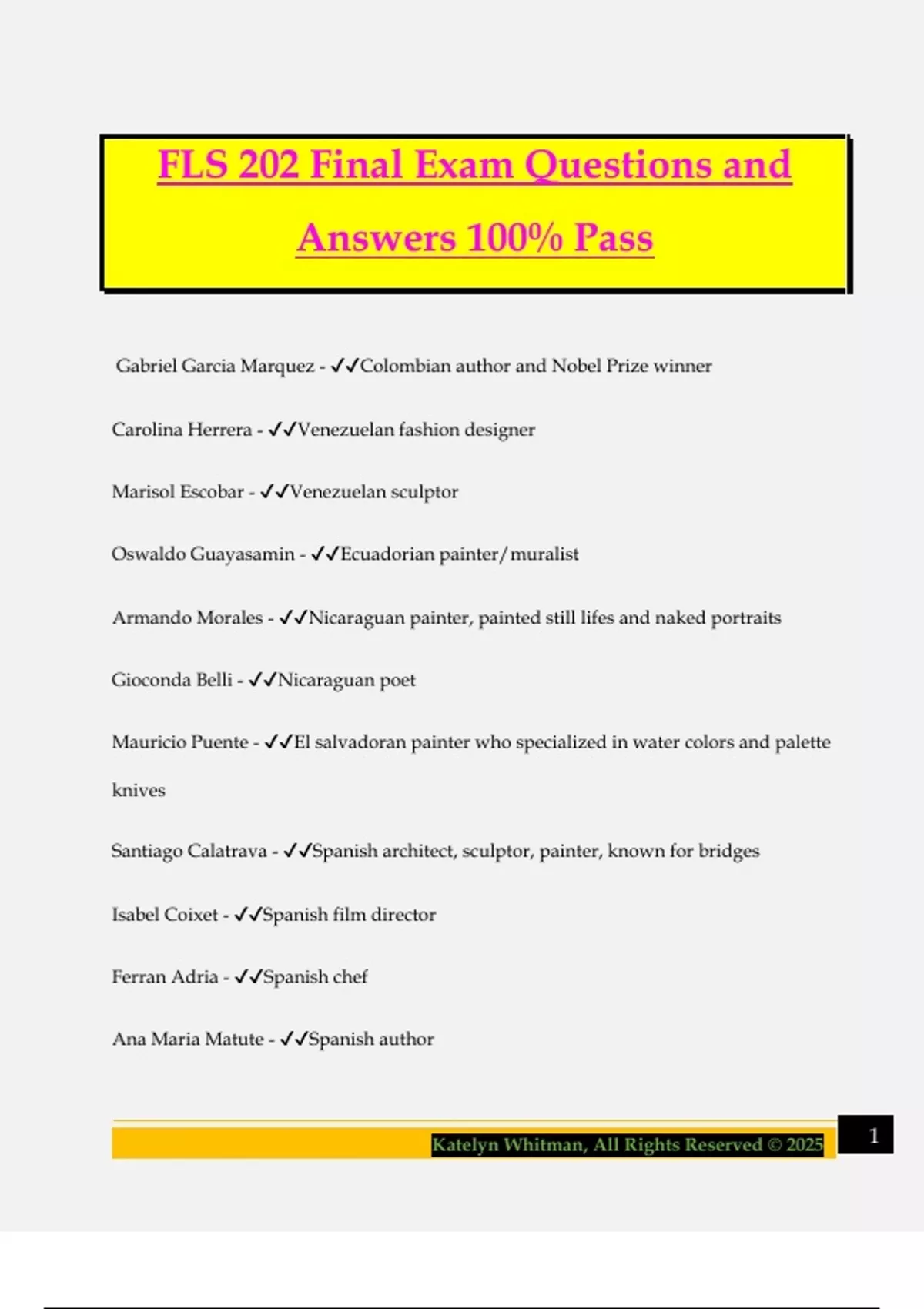 FLS 202 Final Exam Questions and Answers 100% Pass Gabriel Garcia Marquez - Colombian author and Nobel Prize winner Carolina Herrera - Venezuelan fashion designer Marisol Escobar - Venezuelan sculptor Oswaldo Guayasamin - Ecuadorian painter/muralist Armando Morales - Nicaraguan painter, painted still lifes and naked portraits Gioconda Belli - Nicaraguan poet Mauricio Puente - El salvadoran painter who specialized in water colors and palette knives Santiago Calatrava - Spanish architect, sculptor, painter, known for bridges Isabel Coixet - Spanish film director