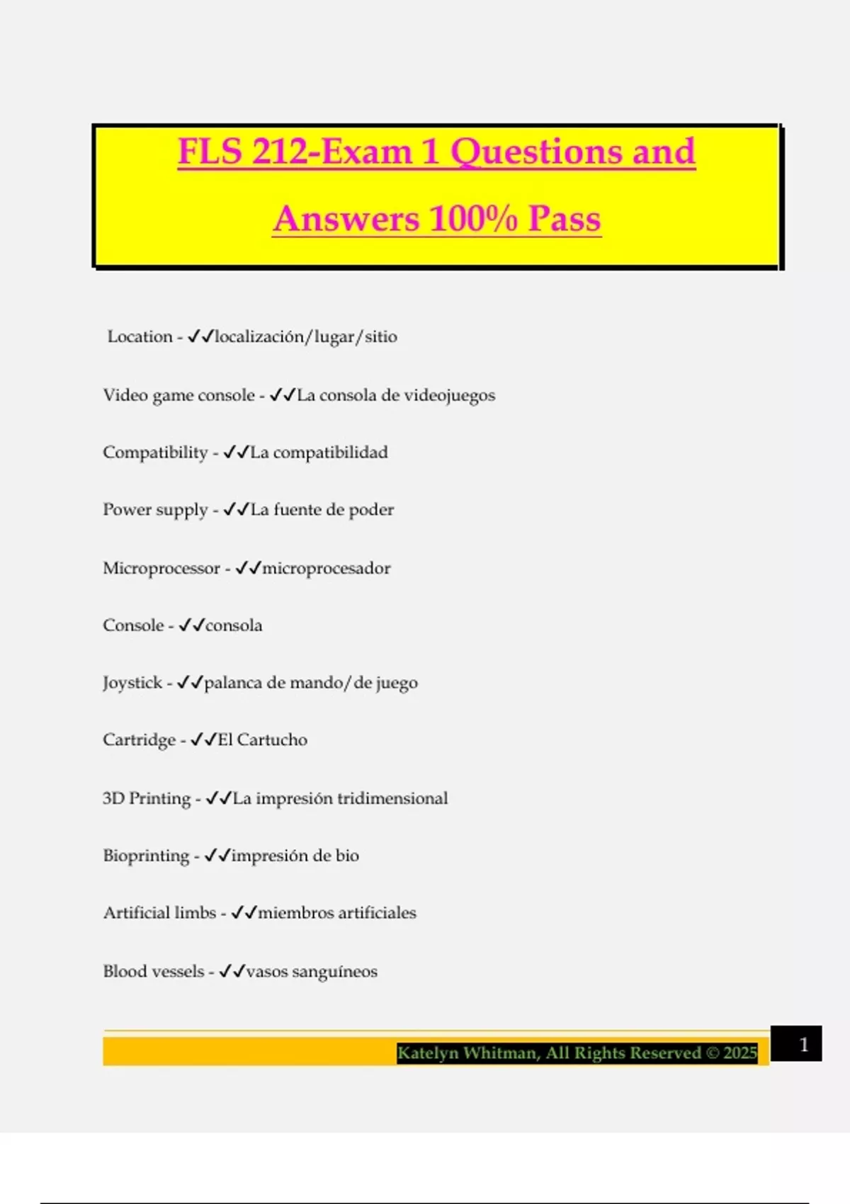 FLS 212-Exam 1 Questions and Answers 100% Pass Location - localización/lugar/sitio Video game console - La consola de videojuegos Compatibility - La compatibilidad Power supply - La fuente de poder Microprocessor - microprocesador Console - consola Joystick - palanca de mando/de juego Cartridge - El Cartucho 3D Printing - La impresión tridimensional Bioprinting - impresión de bio Artificial limbs - miembros artificiales Blood vessels - vasos sanguíneos