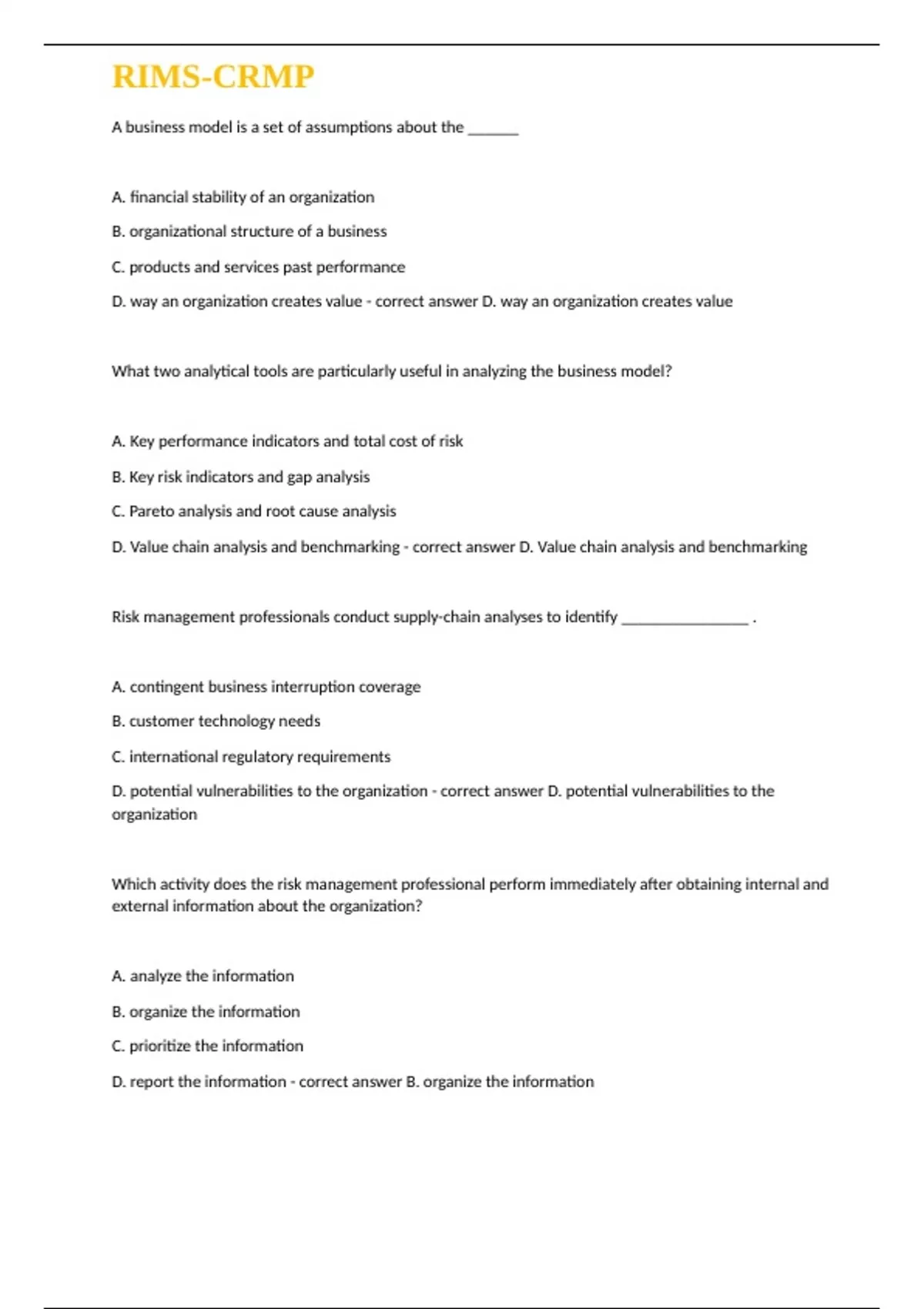D. potential vulnerabilities to the organization - correct answer D. potential vulnerabilities to the