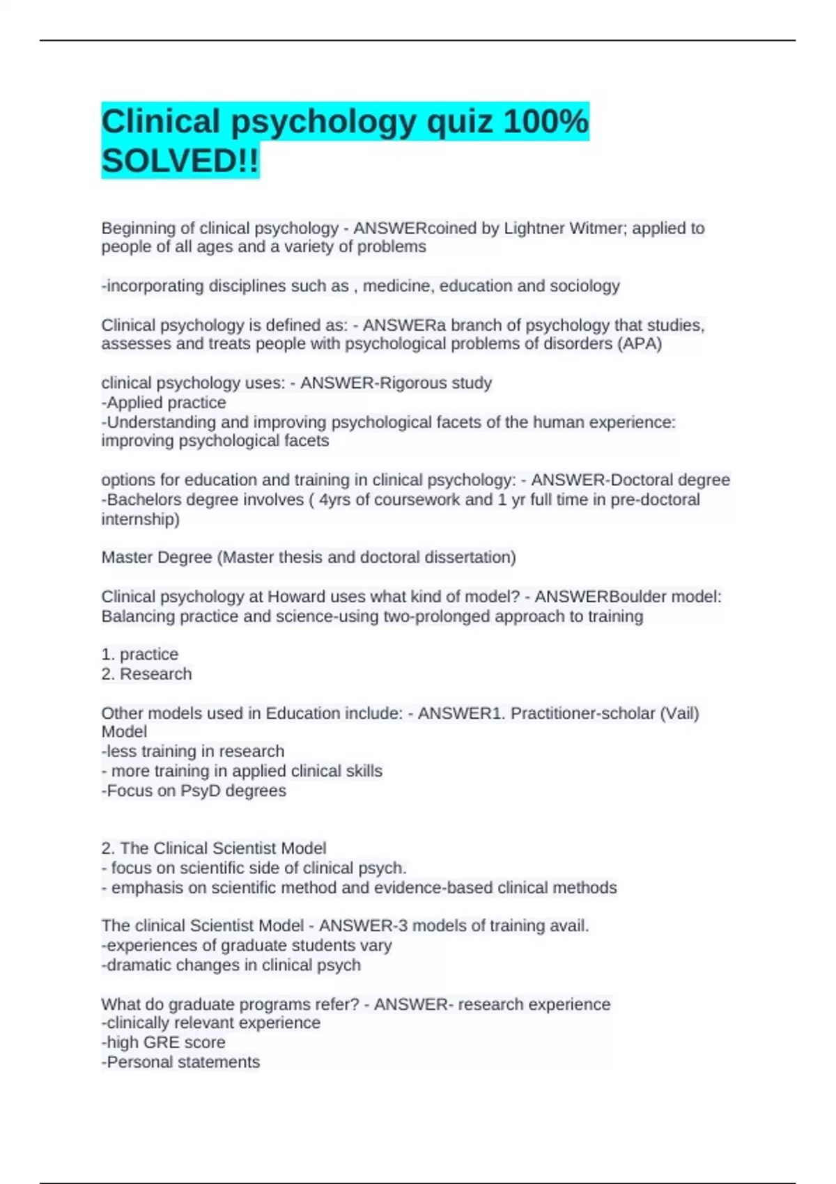 Beginning of clinical psychology - ANSWERcoined by Lightner Witmer; applied to people of all ages and a variety of problems -incorporating disciplines such as , medicine, education and sociology Clinical psychology is defined as: - ANSWERa branch of psychology that studies, assesses and treats people with psychological problems of disorders (APA) clinical psychology uses: - ANSWER-Rigorous study -Applied practice -Understanding and improving psychological facets of the human experience: improving psychological facets options for education and training in clinical psychology: - ANSWER-Doctoral degree -Bachelors degree involves ( 4yrs of coursework and 1 yr full time in pre-doctoral internship) Master Degree (Master thesis and doctoral dissertation) Clinical psychology at Howard uses what kind of model? - ANSWERBoulder model: Balancing practice and science-using two-prolonged approach to training 1. practice 2. Research Other models used in Education include: - ANSWER1. Practitioner-scholar (Vail) Model -less training in research - more training in applied clinical skills -Focus on PsyD degrees 2. The Clinical Scientist Model - focus on scientific side of clinical psych. - emphasis on scientific method and evidence-based clinical methods The clinical Scientist Model - ANSWER-3 models of training avail. -experiences of graduate students vary -dramatic changes in clinical psych What do graduate programs refer? - ANSWER- research experience -clinically relevant experience -high GRE score -Personal statements -get to know your professors' -consider log-term goals - research how graduate programs assess - prepare for admission interviews Predoctoral Internship (types of internship) - ANSWER-1 yr of supervised clinical experience in an applied setting - year of transition or advanced apprenticeship Postdoctoral Internship (types of internship) - ANSWER- Takes 1 to 2 yrs - under supervision (more advance than predoc) -specialized training -required number of hours for license Getting Licensed requirements - ANSWEREPPP-Examination for Professional Practice in Psych