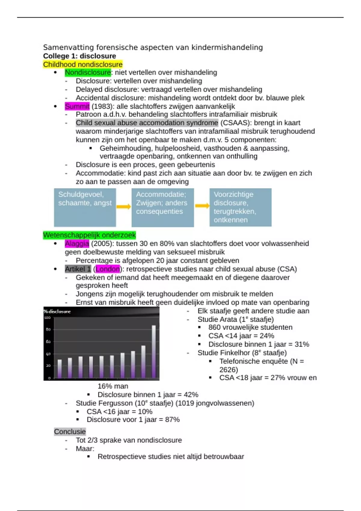Deze samenvatting (aantekeningen van hoorcolleges en literatuur) is bedoeld voor studenten die het keuzevak/onderdeel van minor forensische aspecten van kindermishandeling volgen. Het bevat de stof dat wordt getoetst in blok 2. Literatuur dat hiervoor is gebruikt: - London et al. (2005). Disclosure of child sexual abuse: What does the research tell us about the ways that children tell? - Lemaigre et al. (2017). Barriers and facilitators to disclosing sexual abuse in childhood and adolescence: A systematic review. - Hershkowitz et al. (2007). Victimization of children with disabilities. - Lavoie et al. (2022). Do children unintentionally report maltreatment? Comparison of disclosures of neglect versus sexual abuse. - Otgaar en Jelicic (2017).Routes van het recht - over de rechtspsychologie. p.573-577 tot aan 'de functie van het geheugen' - Goodman et al. (2014). Children's eyewitness memory: the influence of cognitive and socio-emotional factors. - Loftus (2005). Planting misinformation in the human mind: a 30 year investigation of the malleability of memory. - McNally et al. (2009). A new solution to the recovered memory debate. - Benia et al. (2015). The NICHD investigative interview protocol: A meta-analytic review. - Dekens et al. (2013). Handleiding het kind als getuige. H6 en deel van H7 - Hritz et al. (2015). Children's suggestibility research: Things to know before interviewing a child. Alleen informatie over confirmation bias (pagina 9/10) - Moreno (2003). Einstein on the bench? Exposing what judges do not know about science and using child abuse cases to improve how courts evaluate scientific evidence. - Harris (2010). Bruises in children: normal or child abuse? - Johnson et al. (2021). Bruising: the most common injury in physical child abuse - Tener et al. (2015). A typology of offenders who use online communications to commit sex crimes against minors. - Miyamoto, S., Romano, P. S., Putnam-Hornstein, E., Thurston, H., Dharmar et al. (2017). Risk factors for fatal and non-fatal child maltreatment in families previously investigated by CPS: A case-control study. - Barr (2012). Preventing abusive head trauma resulting from a failure of normal interaction between infants and their caregivers. - Stith et al. (2022). Using systemic interventions to reduce intimate partner violence or child maltreatment: A systematic review of publications between 2010 and 2019 (alleen de stukken mbt kindermishandeling) - Barth et al. (2024). Shared family care: Out-of-home care programs for serving parents and children together. - Doelman et al. (2024). Parents' perspectives on the results of mandatory child protection support: A qualitative study. - Scheuplein et al. (2021). Child Maltreatment and Victimization. - Fitton et al.(2020). Childhood maltreatment and violent outcomes: A systematic review and meta-analysis of prospective studies. - Wright et al. (2019). The cycle of violence revisited: Childhood victimization, resilience, and future violence. De kleuren in de tekst geven belangrijke punten aan. Geel: belangrijk onderwerp/begrip Groen: subonderwerp/hoort bij belangrijk begrip Grijs: overige belangrijke woorden/woorden die bij groen horen Roze: belangrijke personen