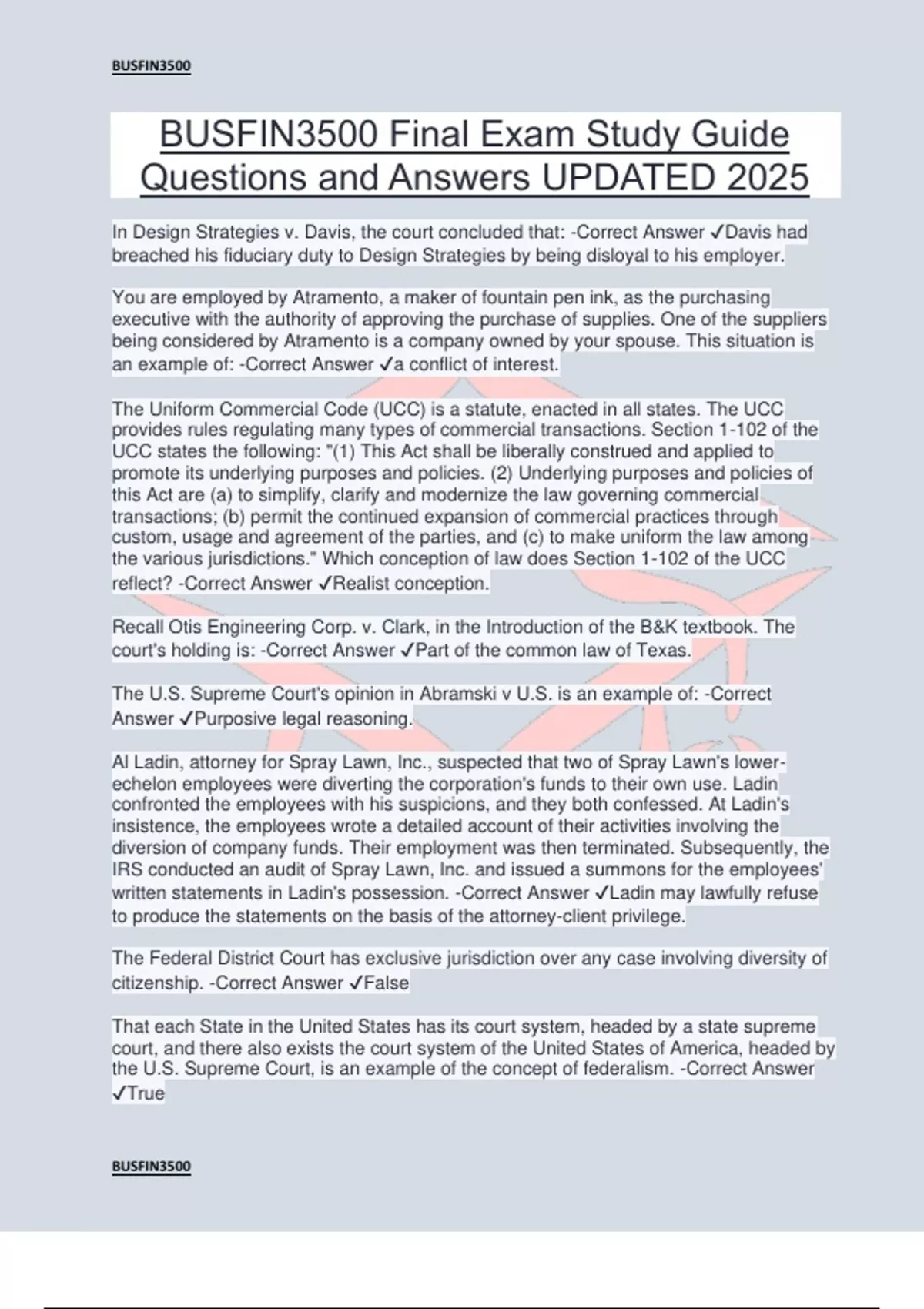 BUSFIN3500 Final Exam Study Guide Questions and Answers UPDATED 2025