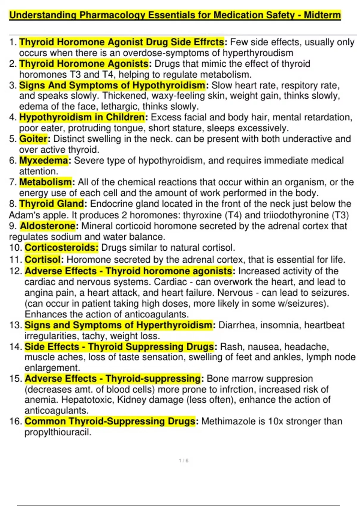 6. Myxedema: Severe type of hypothyroidism, and requires immediate medical