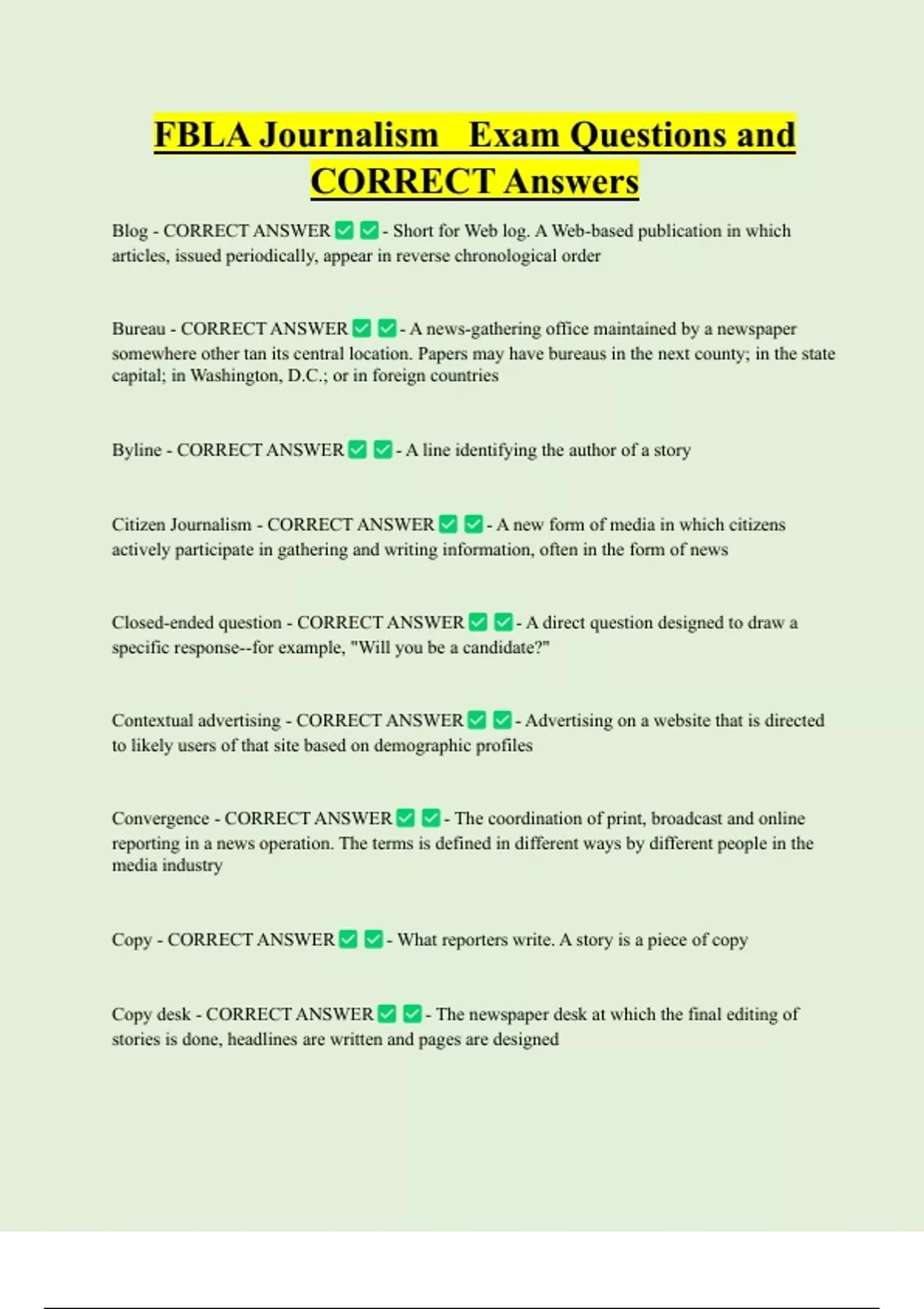 FBLA Journalism Exam Questions and CORRECT Answers Blog - CORRECT ANSWER - Short for Web log. A Web-based publication in which articles, issued periodically, appear in reverse chronological order Bureau - CORRECT ANSWER - A news-gathering office maintained by a newspaper somewhere other tan its central location. Papers may have bureaus in the next county; in the state capital; in Washington, D.C.; or in foreign countries