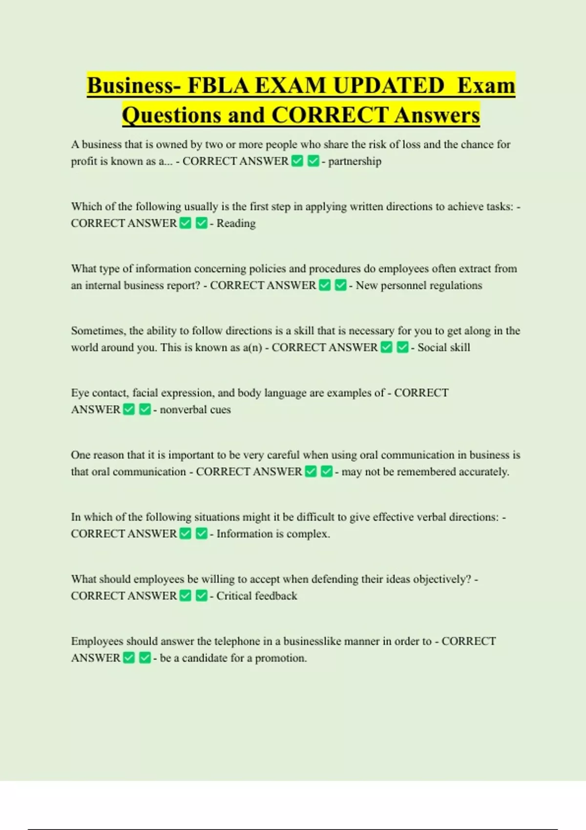 Business- FBLA EXAM UPDATED Exam Questions and CORRECT Answers A business that is owned by two or more people who share the risk of loss and the chance for profit is known as a... - CORRECT ANSWER - partnership Which of the following usually is the first step in applying written directions to achieve tasks: - CORRECT ANSWER - Reading