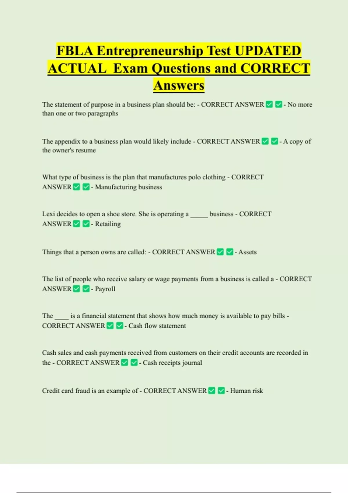 FBLA Entrepreneurship Test UPDATED ACTUAL Exam Questions and CORRECT Answers The statement of purpose in a business plan should be: - CORRECT ANSWER - No more than one or two paragraphs The appendix to a business plan would likely include - CORRECT ANSWER - A copy of the owner's resume