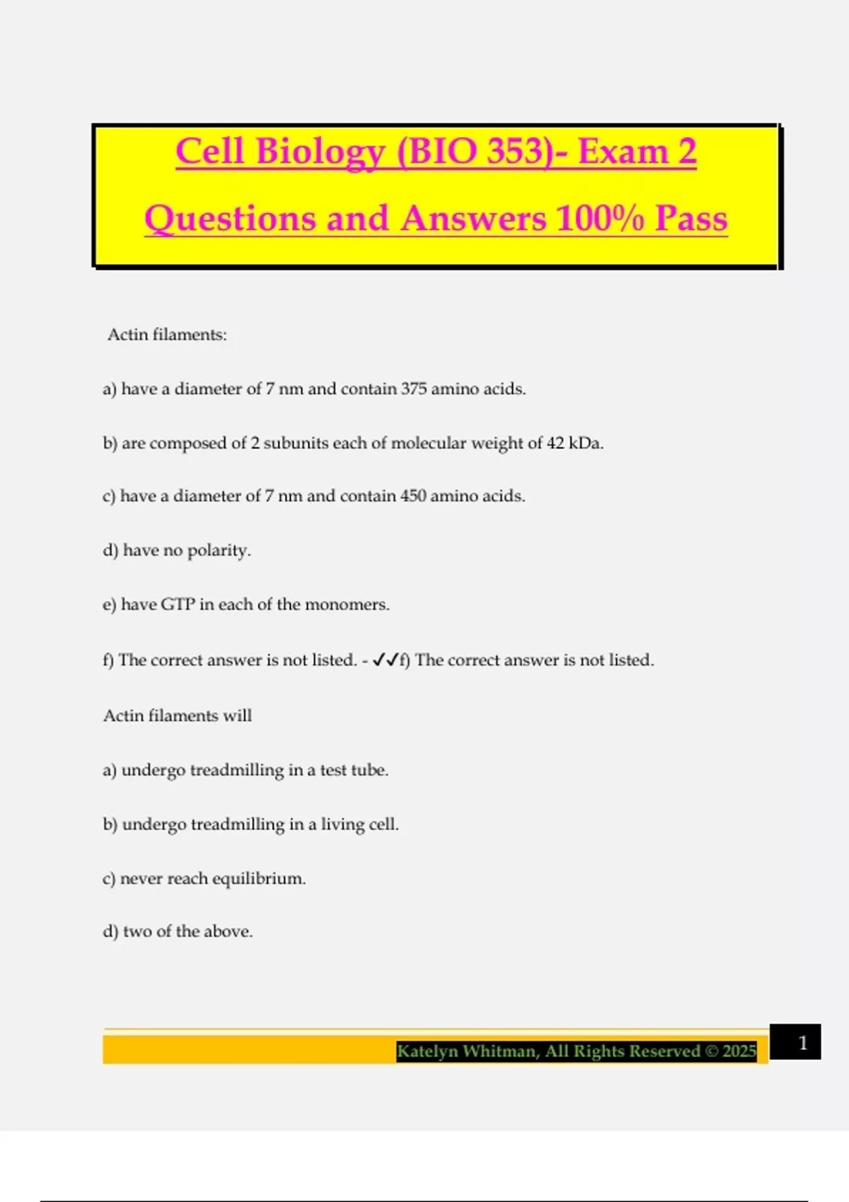Cell Biology (BIO 353)- Exam 2 Questions and Answers 100% Pass Actin filaments: a) have a diameter of 7 nm and contain 375 amino acids. b) are composed of 2 subunits each of molecular weight of 42 kDa. c) have a diameter of 7 nm and contain 450 amino acids. d) have no polarity. e) have GTP in each of the monomers. f) The correct answer is not listed. - f) The correct answer is not listed. Actin filaments will a) undergo treadmilling in a test tube. b) undergo treadmilling in a living cell. c) never reach equilibrium. d) two of the above. 2Katelyn Whitman, All Rights Reserved © 2025 e) none of the above. - d) two of the above. The number of amino acids in an actin monomer is: a) 375 b) 450 c) 460 -780 d) 750 f) none of the above - a) 375 Hydrolysis of ATP to ADP: a) helps identify the assembly vs the disassembly end b) is used in dynamic instability c) has a role when the actin filament is in chemical equilibrium with the actin filament monomers d) is important for the nucleation site e) none of the above - a) helps identify the assembly vs the disassembly end Actin filaments associate with a nucleotide triphosphate. a) True 3Katelyn Whitman, All Rights Reserved © 2025 b) False - a) True Treadmilling of actin filaments only occurs in a test tube. a) True b) False - b) False Preassembled nucleation sites in a living cell are equ