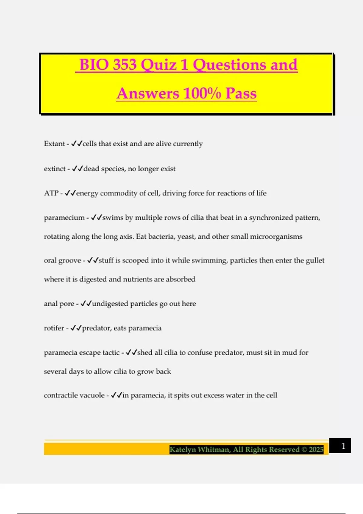 BIO 353 Quiz 1 Questions and Answers 100% Pass Extant - cells that exist and are alive currently extinct - dead species, no longer exist ATP - energy commodity of cell, driving force for reactions of life paramecium - swims by multiple rows of cilia that beat in a synchronized pattern, rotating along the long axis. Eat bacteria, yeast, and other small microorganisms oral groove - stuff is scooped into it while swimming, particles then enter the gullet where it is digested and nutrients are absorbed anal pore - undigested particles go out here rotifer - predator, eats paramecia paramecia escape tactic - shed all cilia to confuse predator, must sit in mud for several days to allow cilia to grow back contractile vacuole - in paramecia, it spits out excess water in the cell 2Katelyn Whitman, All Rights Reserved © 2025 Why are cells small? - At a certain diameter, oxygen and nutrients can't diffuse into interior of cell, nor can waste products be removed How do social systems help cells? - They divide up labor by specializing certain cells for special functions. Form precursors of different tissues. How does division of labor help cells? - Enables the organism to be more robust, can engage in many activities Totipotent embryonic stem cell - Can become an endoderm, mesoder, or ectoderm endoderm - lung, pancreas mesoderm - heart muscle, red blood cell ectoderm - skin, neuron Induced pluripotent stem cells - adult bone marrow, skin, cord blood, and deciduous teeth Cell shape is related to ___________ - cell function Cell type - a means of recognizing the subdivision of labor in the social system of a multicellular organism (diff phenotype and a diff function of the cell) Neuron - present in the nervous system of the body, a principle function is to provide pathway for action potentials used in cell communication 3Katelyn Whitman, All Rights Reserved © 2025 Cilia in epithelium - line our bronchioles, move mucus out of the lungs until it reaches the top of the throat, where it is then swallowed and destroyed by the acids in the stomach dendritic cell - antigen presenting, engulfs pathogens and digests them into small pieces which are presented on the cell surface, and migrate to the lymph system T or B lymphocytes - if antigens are recognized by these, the cells beco