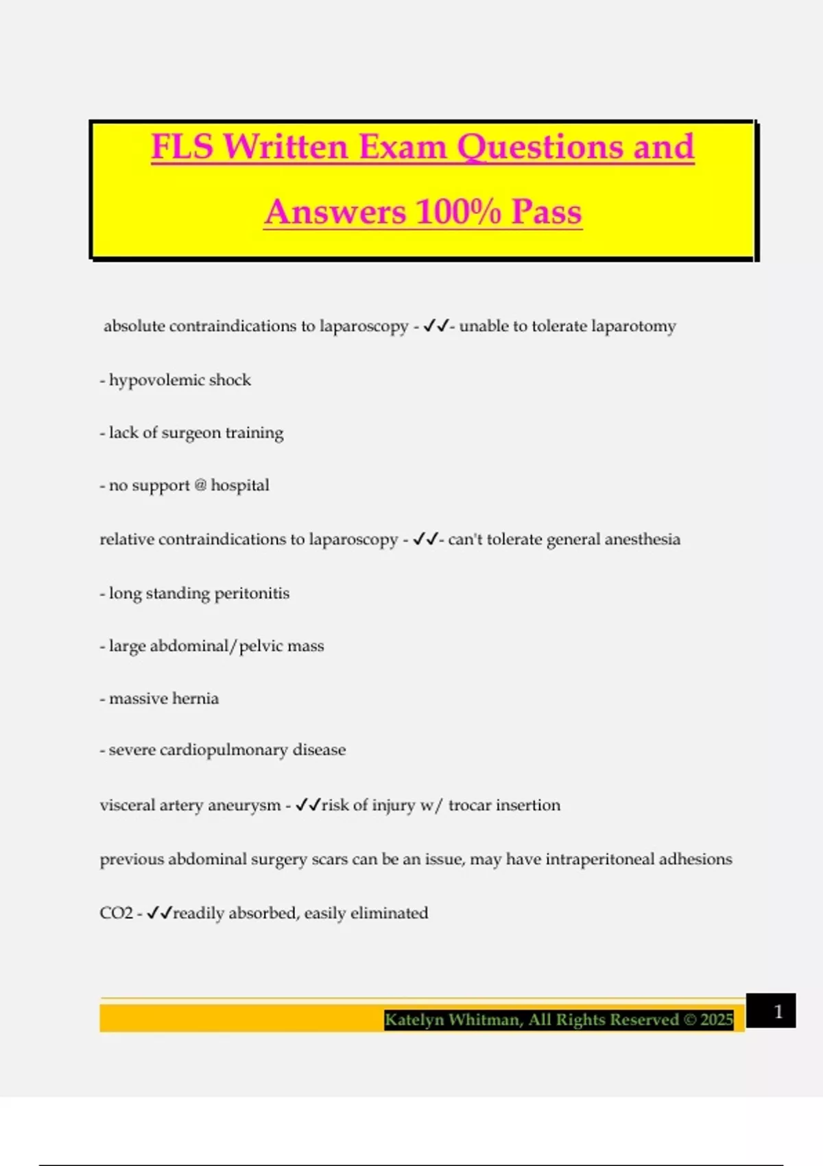 FLS Written Exam Questions and Answers 100% Pass absolute contraindications to laparoscopy - - unable to tolerate laparotomy - hypovolemic shock - lack of surgeon training - no support @ hospital relative contraindications to laparoscopy - - can't tolerate general anesthesia - long standing peritonitis - large abdominal/pelvic mass - massive hernia - severe cardiopulmonary disease visceral artery aneurysm - risk of injury w/ trocar insertion previous abdominal surgery scars can be an issue, may have intraperitoneal adhesions CO2 - readily absorbed, easily eliminated
