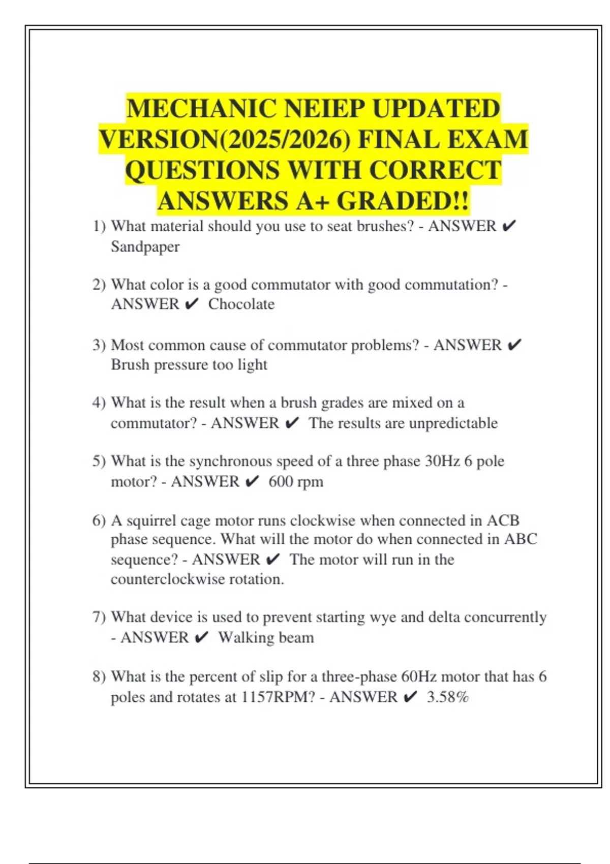 MECHANIC NEIEP UPDATED VERSION(2025/2026) FINAL EXAM QUESTIONS WITH CORRECT ANSWERS A+ GRADED!! 1) What material should you use to seat brushes? - ANSWER Sandpaper 2) What color is a good commutator with good commutation? - ANSWER Chocolate 3) Most common cause of commutator problems? - ANSWER Brush pressure too light 4) What is the result when a brush grades are mixed on a commutator? - ANSWER The results are unpredictable 5) What is the synchronous speed of a three phase 30Hz 6 pole motor? - ANSWER 600 rpm 6) A squirrel cage motor runs clockwise when connected in ACB phase sequence. What will the motor do when connected in ABC sequence? - ANSWER The motor will run in the counterclockwise rotation. 7) What device is used to prevent starting wye and delta concurrently - ANSWER Walking beam 8) What is the percent of slip for a three-phase 60Hz motor that has 6 poles and rotates at 1157RPM? - ANSWER 3.58% 9) Synchronous speed - ANSWER The speed of the stator's magnetic field on an induction motor 10) AC induction motors... - ANSWER uses a stator to act as a rotating field 11) A motor that can run on both AC and DC - ANSWER Universal Motor 12) Polarized electrolytic capacitors - ANSWER Voltage polarity must be correct 13) What happens in a circuit when the capacitor voltage equals the source voltage? - ANSWER Current flow stops in the circuit 14) What happens to capacitors the instant when power is applied? - ANSWER Current is maximum 15) If a circuit has a capacitor of 5 microfarads and a source voltage of 120 volts DC through a resistance of 200K, how long will it take to fully charge? - ANSWER 5 seconds 16) If two capacitors in parallel have equal reactance of 40 ohms, what is the total reactance? - ANSWER 20 ohms 17) What will be the total capacitance if two 125microfarad capacitors are in parallel - ANSWER 250 microfarads 18) What is the unit of inductance? - ANSWER Henry 19) What effect does CEMF have in an inductive circuit? - ANSWER It is an opposing force to the applied voltage which resists changes in circuit current 20) At what point is CEMF greatest in an inductive circuit? - ANSWER When the rate of change for current is maximum 21) In a 100 volt 60Hz circuit, what is the total reactance with a 4 Henry inductor in the circuit? - ANSWER 1507 ohms 22) When using a megger to check insulation resistance to ground, what is an acceptable minimum resistance? - ANSWER 1 M ohm 23) What are the terminal designation of the diode? - ANSWER Anode and cathode 24) What is the voltage drop across a silicon diode that is forward biased? - ANSWER 0.7 volts 25) What type of rectifier uses four diodes to convert the AC to DC? - ANSWER Full wave bridge 26) Zener Diodes - ANSWER Designed to operate in reverse bias mode
