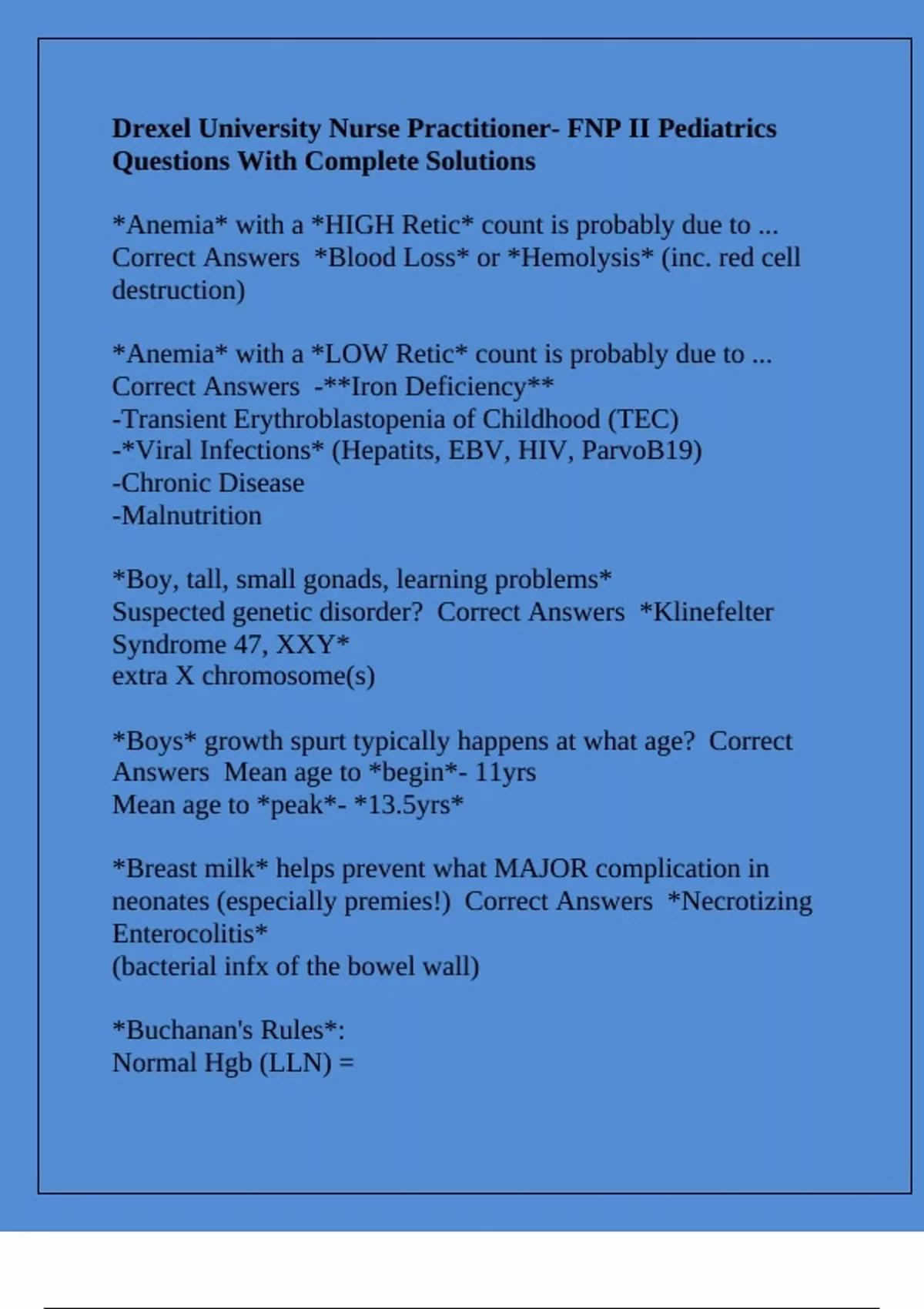 ,Normal MCV (LLN) = Correct Answers *Nl Hgb = 11 + (0.1 x