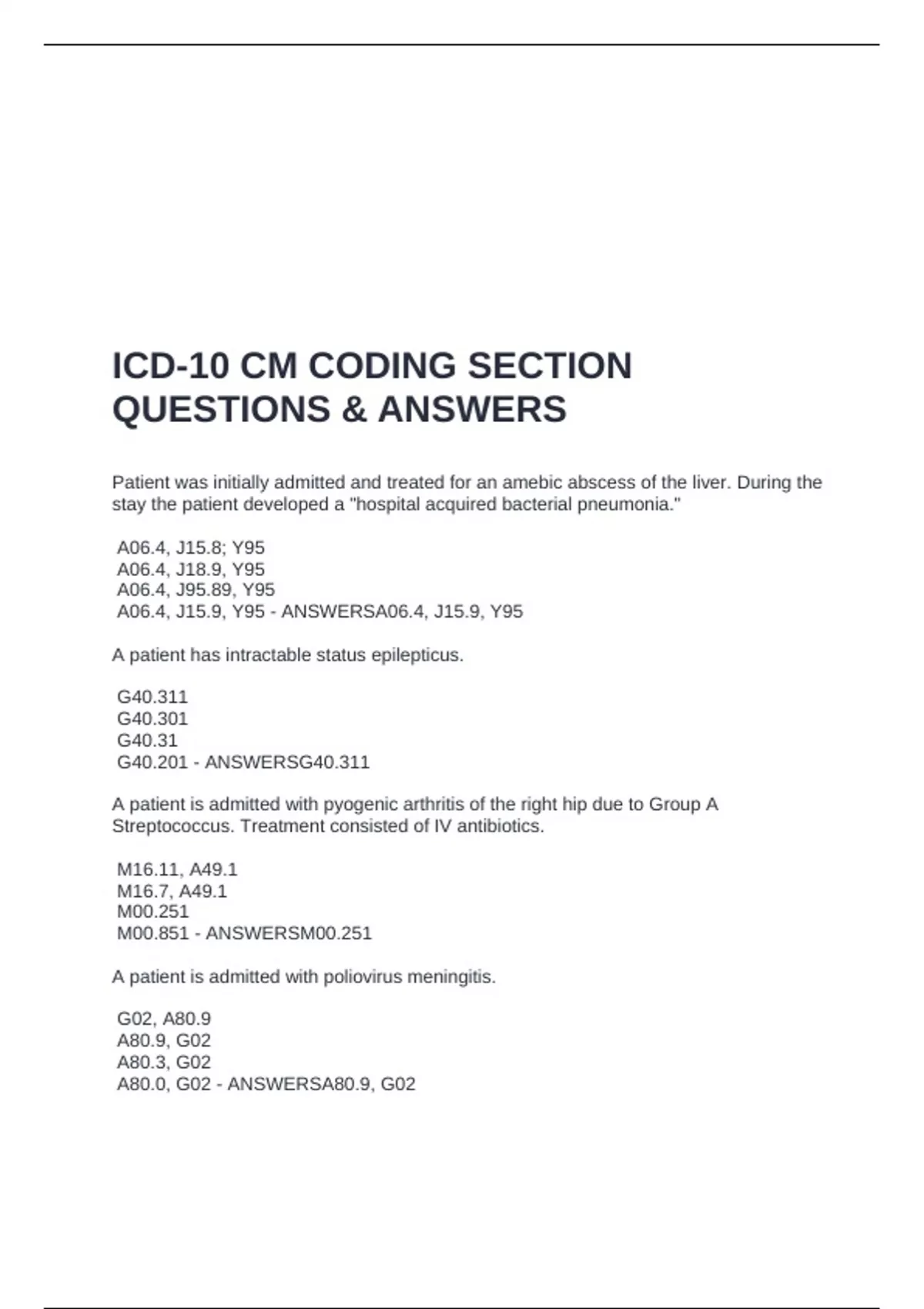 A06.4, J15.9, Y95 - ANSWERSA06.4, J15.9, Y95
