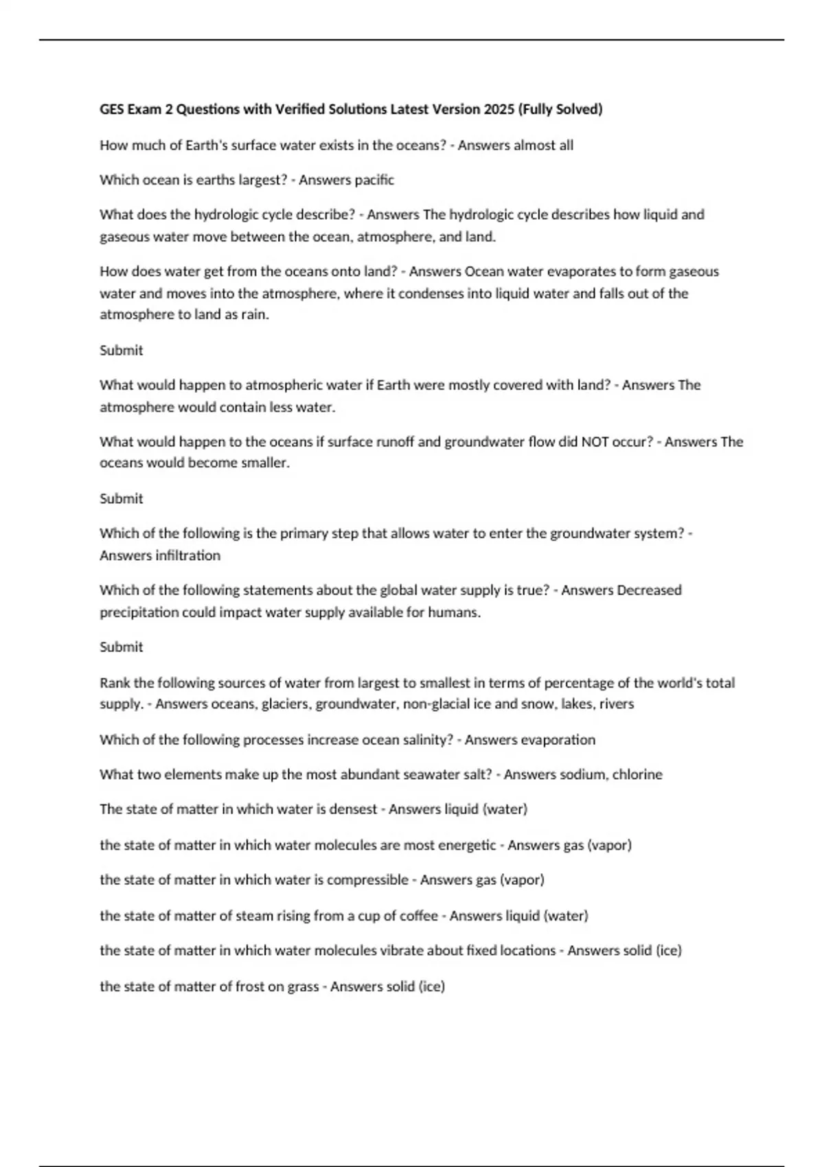 GES Exam 2 Questions with Verified Solutions Latest Version 2025 (Fully Solved) How much of Earth's surface water exists in the oceans? - Answers almost all Which ocean is earths largest? - Answers pacific What does the hydrologic cycle describe? - Answers The hydrologic cycle describes how liquid and gaseous water move between the ocean, atmosphere, and land. How does water get from the oceans onto land? - Answers Ocean water evaporates to form gaseous water and moves into the atmosphere, where it condenses into liquid water and falls out of the atmosphere to land as rain. Submit What would happen to atmospheric water if Earth were mostly covered with land? - Answers The atmosphere would contain less water. What would happen to the oceans if surface runoff and groundwater flow did NOT occur? - Answers The oceans would become smaller. Submit Which of the following is the primary step that allows water to enter the groundwater system? - Answers infiltration Which of the following statements about the global water supply is true? - Answers Decreased precipitation could impact water supply available for humans. Submit Rank the following sources of water from largest to smallest in terms of percentage of the world's total supply. - Answers oceans, glaciers, groundwater, non-glacial ice and snow, lakes, rivers Which of the following processes increase ocean salinity? - Answers evaporation What two elements make up the most abundant seawater salt? - Answers sodium, chlorine The state of matter in which water is densest - Answers liquid (water) the state of matter in which water molecules are most energetic - Answers gas (vapor) the state of matter in which water is compressible - Answers gas (vapor) the state of matter of steam rising from a cup of coffee - Answers liquid (water) the state of matter in which water molecules vibrate about fixed locations - Answers solid (ice) the state of matter of frost on grass - Answers solid (ice) Which term describes the process by which water vapor changes to the liquid state? - Answers condensation When water changes directly from gas to solid without occurring as a liquid, which process is taking place? - Answers deposition When water changes from one state to another, which process releases more heat energy? - Answers deposition On a clear, sunny winter day with an outside temperature of -10ºC, you hang your freshly laundered clothes outside. In the morning when you hung them out, the wet clothes quickly froze, but went to being completely dry by afternoon. What change of state has occurred in the water? - Answers sublimation After mowing the lawn on a hot, hazy, humid day, you get a large glass from the kitchen and fill it with ice and water. Immediately, drops of liquid water form on the outside of the glass. Which change in the state of water are you observing on your glass? - Answers condensation Which of the following is an example of sublimation? - Answers change from ice to water vapor Submit What must break in order for water to change from solid to liquid to gas? - Answers hydrogen bonds between water molecules Submit How much heat energy is needed to melt 1 gram of ice? - Answers 80 calories of heat energy Why does temperature NOT initially increase as energy is added after ice begins to melt? - Answers The added energy is used to break hydrogen bonds between water molecules. Submit What physically breaks hydrogen bonds between water molecules as ice melts? - Answers movement of water molecules What do we call the energy used to melt ice once the ice becomes water? - Answers latent heat of water How much heat energy is needed to turn 1 gram of water at 100 degrees Celsius into water vapor? - Answers 540 calories of heat energy How can water vapor become ice? - Answers Water vapor can become liquid water through the release of heat energy, and then become ice through the release of more heat energy. Water