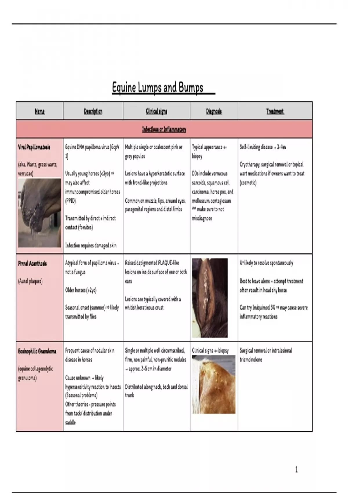 Study guide/table featuring equine skin diseases, complete with pictures and diagrams. Complete with Disease, description, clinical signs, diagnosis method, treatment and prevention.
