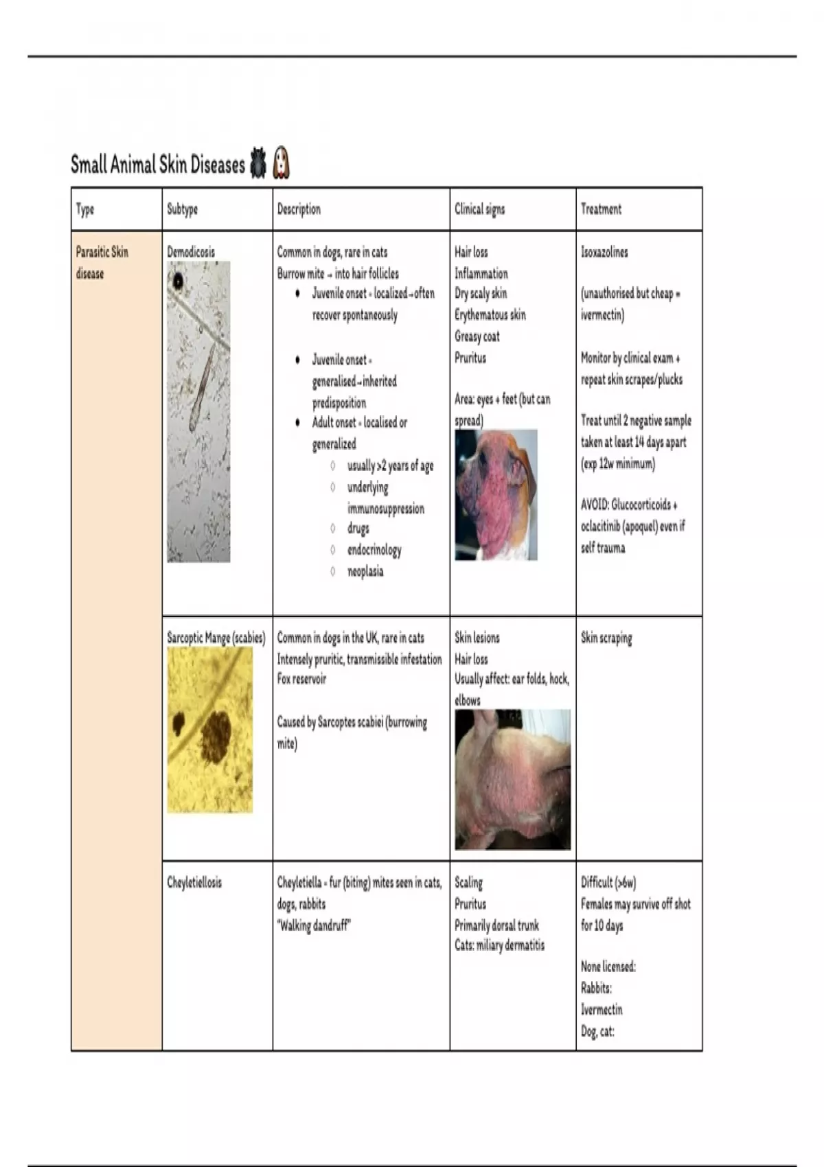 Study guide and Summary table of important small animal skin disease with pictures showing clinical signs. Including information about disease description, clinical signs, treatment options, prevention ,etc.