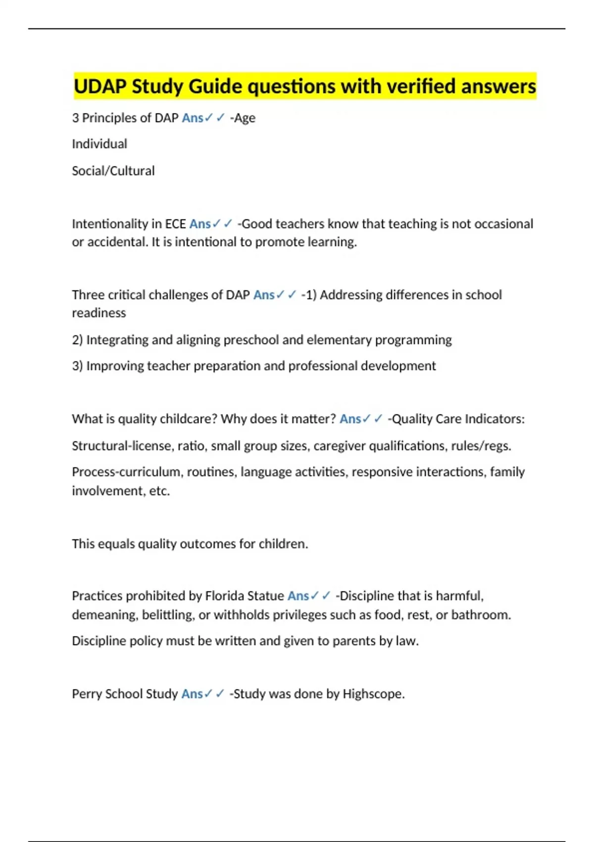 Perry School Study Ans✓✓ -Study was done by Highscope.