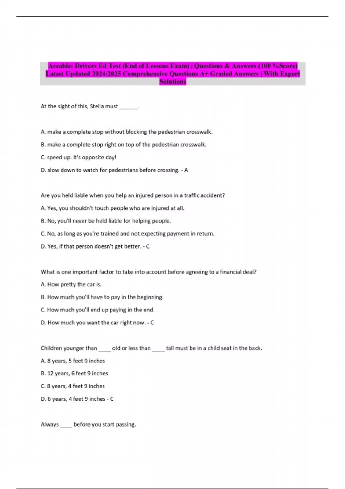 Aceable: Drivers Ed Test (End of Lessons Exam) | Questions & Answers