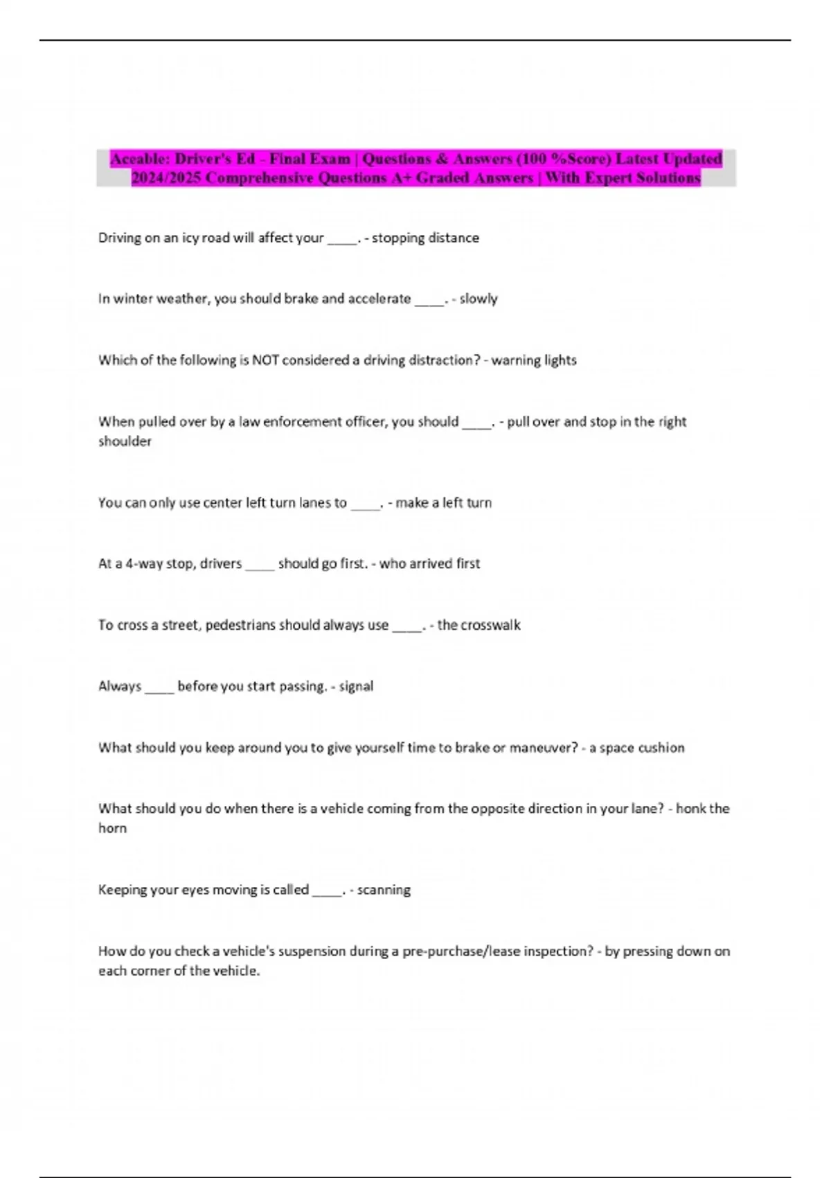 Aceable: Driver's Ed - Final Exam | Questions & Answers