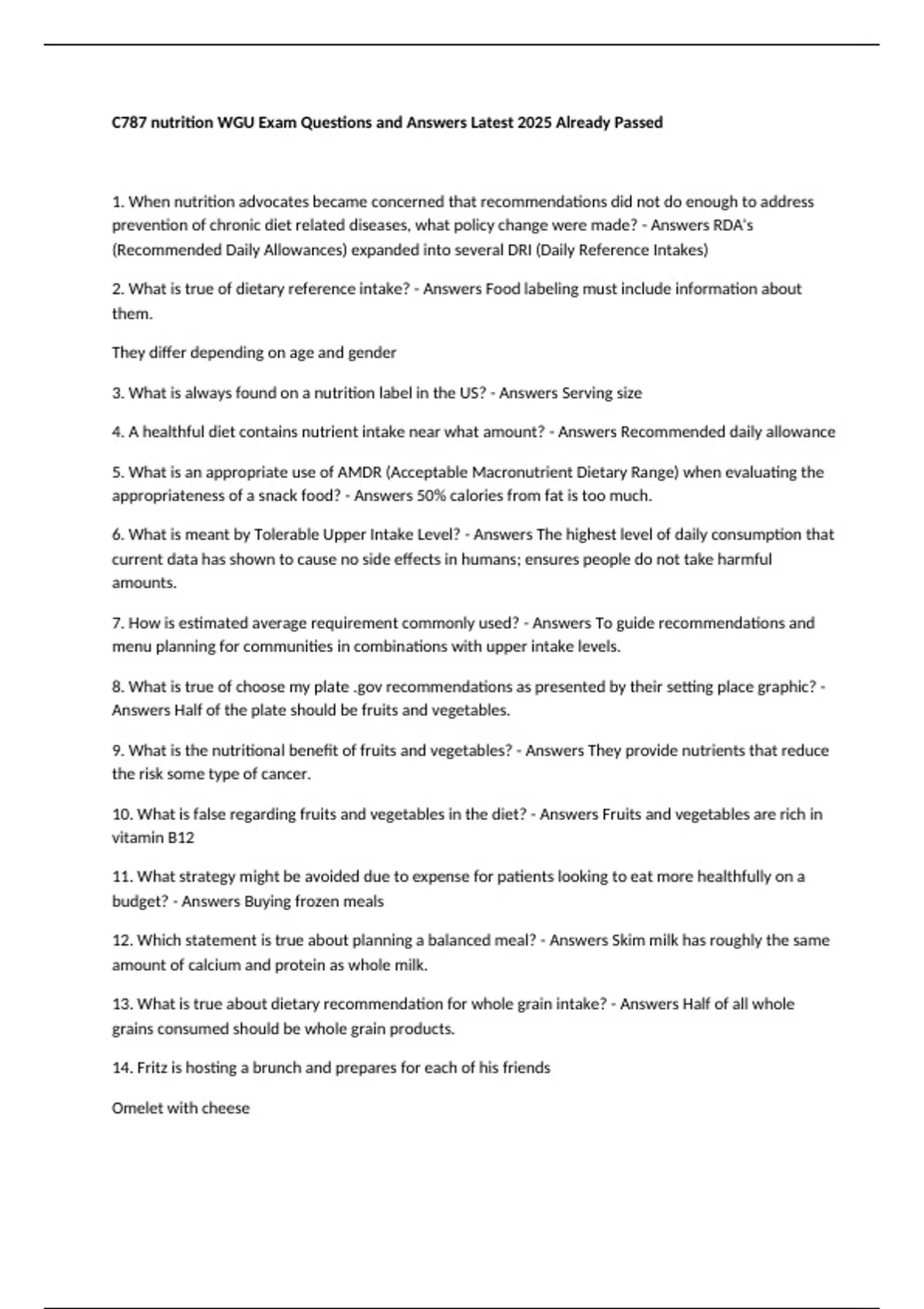 C787 nutrition WGU Exam Questions and Answers Latest 2025 Already Passed 1. When nutrition advocates became concerned that recommendations did not do enough to address prevention of chronic diet related diseases, what policy change were made? - Answers RDA's (Recommended Daily Allowances) expanded into several DRI (Daily Reference Intakes) 2. What is true of dietary reference intake? - Answers Food labeling must include information about them. They differ depending on age and gender 3. What is always found on a nutrition label in the US? - Answers Serving size 4. A healthful diet contains nutrient intake near what amount? - Answers Recommended daily allowance 5. What is an appropriate use of AMDR (Acceptable Macronutrient Dietary Range) when evaluating the appropriateness of a snack food? - Answers 50% calories from fat is too much. 6. What is meant by Tolerable Upper Intake Level? - Answers The highest level of daily consumption that current data has shown to cause no side effects in humans; ensures people do not take harmful amounts. 7. How is estimated average requirement commonly used? - Answers To guide recommendations and menu planning for communities in combinations with upper intake levels. 8. What is true of choose my plate .gov recommendations as presented by their setting place graphic? - Answers Half of the plate should be fruits and vegetables. 9. What is the nutritional benefit of fruits and vegetables? - Answers They provide nutrients that reduce the risk some type of cancer. 10. What is false regarding fruits and vegetables in the diet? - Answers Fruits and vegetables are rich in vitamin B12 11. What strategy might be avoided due to expense for patients looking to eat more healthfully on a budget? - Answers Buying frozen meals 12. Which statement is true about planning a balanced meal? - Answers Skim milk has roughly the same amount of calcium and protein as whole milk. 13. What is true about dietary recommendation for whole grain intake? - Answers Half of all whole grains consumed should be whole grain products. 14. Fritz is hosting a brunch and prepares for each of his friends Omelet with cheese Toasted English muffin 1t all fruit preserves ½ large grapefruit 1c whole milk How can his menu be improved to follow the dietary guidelines for Americans? - Answers Use egg whites for the omelets Replace cheese with vegetables in the omelets Replace English muffin with whole wheat English muffin Replace whole milk with fat free milk 15. What is true of recommendations concerning trans fat and added sugar intake? - Answers Trans fat and added sugar intake should be minimized. There is no DRI value. What is recommended daily amount of protein intake? - Answers 60g/ day. 17. Which list contains all examples of protein? - Answers Garbanzo beans (Chickpeas), egg, chicken breast, yogurt, cheese, ground beef, peanut butter, tofu 18. What is the best choice for a combination of plant-based foods to maximize healthy diet in a vegetarian diet? - Answers Legume+ whole grain 19. There is a current initiative for more transparent labeling of sugars on nutrition fact labels. In the coming years, which of these might be more obviously labeled sugars? - Answers Anything ending in-ose, honey 20. Which carbohydrate will cause a quick return to hunger? - Answers One with a higher glycemic index 21. Which is the reason that seafood can be considered a healthful diet? - Answers Some seafood is high in healthy omega 3 oils 22. What are generally considered sources of healthy fat? - Answers Fish, nuts, olive oil 23. What is not a common source of high levels of sodium? - Answers Spices and herbs 24. Which foods are relatively rich in iron? - Answers Dark leafy greens, legumes, red meat, nuts 25. What is the best vegetarian source of iron from the options provided? - Answers Beans 26. Which of these are protective against heart disease? - Answers Fiber, HDL cholesterol 27. Which are linked to increase heart disease risk? - Answers LDL, trans fat, saturated fats 28. Reducing heart disease/ stroke - Answers LDL levels below 120mg/dl Limit cholesterol intake to less than 30mg per day Saturated fats-less than 7% of total daily calories At least 30 minutes of activity in daily routine Sodium levels-below 1600mg per day Increase intake of fiber, especially insoluble fiber, although most will be soluble. Limit alcohol to 1-2 drinks per day. What is an appropriate dietary intervention to address a patient's low albumin level? - Answers High protein diet.