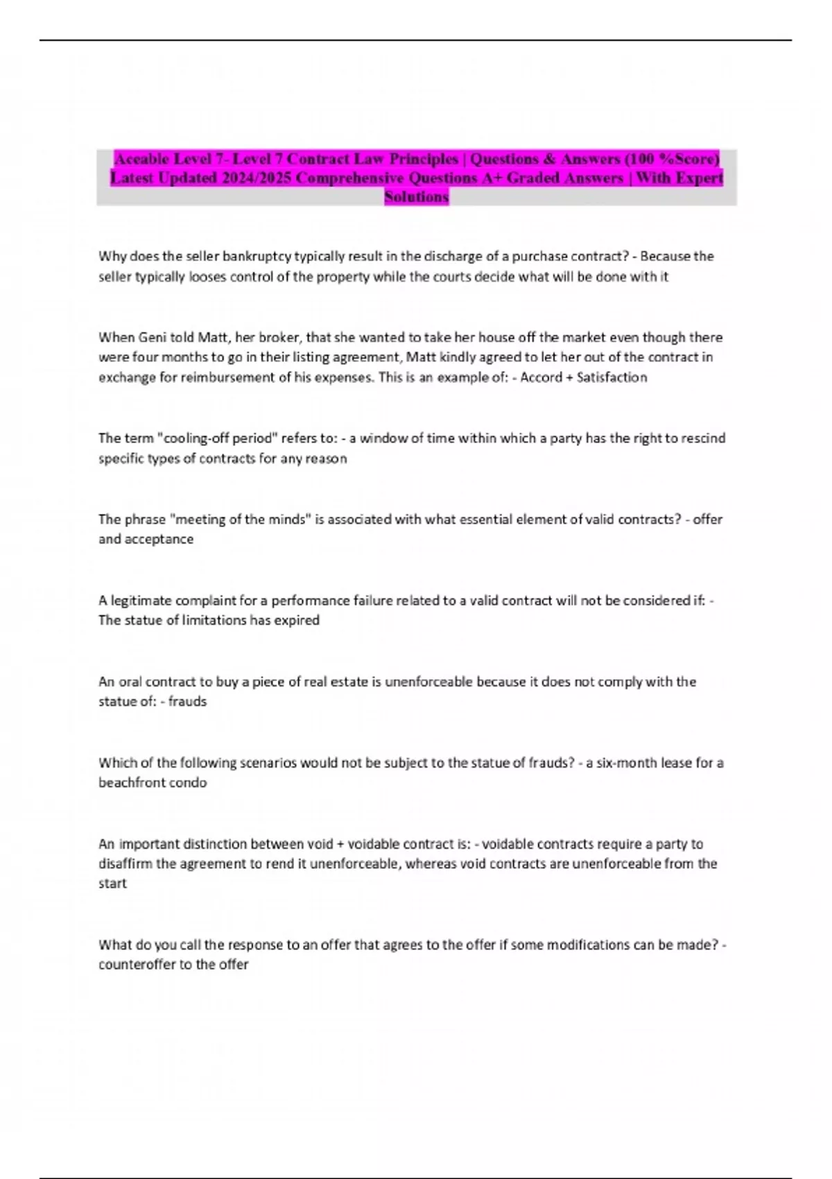 Aceable Level 7- Level 7 Contract Law Principles | Questions & Answers