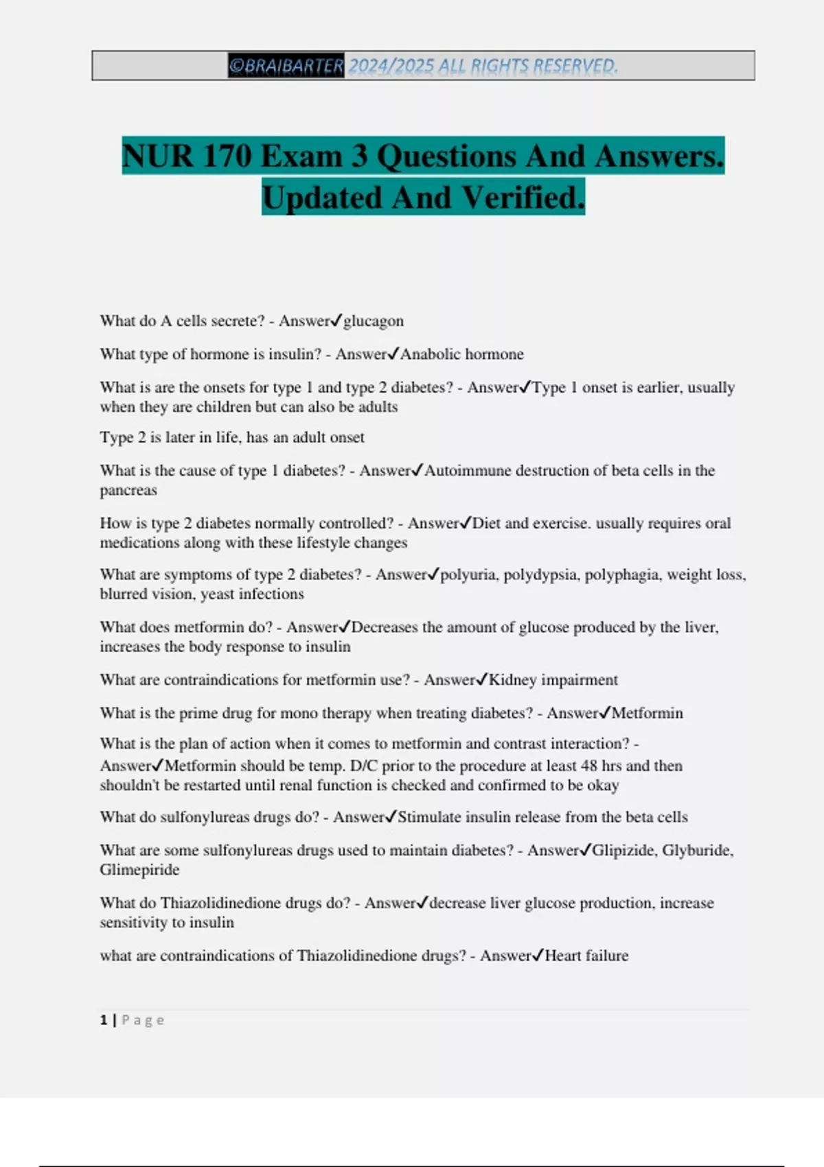 NUR 170 Exam 3 Questions And Answers. Updated And Verified. What do A cells secrete? - Answerglucagon What type of hormone is insulin? - AnswerAnabolic hormone What is are the onsets for type 1 and type 2 diabetes? - AnswerType 1 onset is earlier, usually when they are children but can also be adults Type 2 is later in life, has an adult onset What is the cause of type 1 diabetes? - AnswerAutoimmune destruction of beta cells in the pancreas How is type 2 diabetes normally controlled? - AnswerDiet and exercise. usually requires oral medications along with these lifestyle changes What are symptoms of type 2 diabetes? - Answerpolyuria, polydypsia, polyphagia, weight loss, blurred vision, yeast infections What does metformin do? - AnswerDecreases the amount of glucose produced by the liver, increases the body response to insulin What are contraindications for metformin use? - AnswerKidney impairment What is the prime drug for mono therapy when treating diabetes? - AnswerMetformin What is the plan of action when it comes to metformin and contrast interaction? - AnswerMetformin should be temp. D/C prior to the procedure at least 48 hrs and then shouldn't be restarted until renal function is checked and confirmed to be okay What do sulfonylureas drugs do? - AnswerStimulate insulin release from the beta cells What are some sulfonylureas drugs used to maintain diabetes? - AnswerGlipizide, Glyburide, Glimepiride What do Thiazolidinedione drugs do? - Answerdecrease liver glucose production, increase sensitivity to insulin what are contraindications of Thiazolidinedione drugs? - AnswerHeart failure ©BRAIBARTER 2024/2025 ALL RIGHTS RESERVED. 2 | P a g e Special considerations for when someone is taking Thiazolidinedione drugs? - Answercan cause liver disturbances, so pts have to get liver panels checked every 3 months What do GLP-1 agonist drugs do? - Answerthey work at the level of the beta cells, are agonists for a protein that increases secretion of insulin What are some rapid acting insulins? - AnswerASPART, lispro, glulisine what are some intermediate acting insulins? - AnswerNPH, 70/30, 50/50, 75/25 When should rapid acting insulins such as lispro be given? - Answershould be given within 10 min of meal time When do rapid acting insulin such as lispro peak, and when is it gone - AnswerPeaks within 1 hr of administration, gone between 3 and 5 hrs when do intermediate insulins such as NPH peak and end? - AnswerPeak within 4-12 hrs after admin When do short acting insulins such as regular insulin peak? - AnswerPeak within 2-4 hrs after administration when do long lasting insulin such glargine(Lantus) and insulin detemir(Levemir) peak? - AnswerGlargine has no peak, detemir peaks between 6-8 hrs and has a duration of 5-24 hrs What are the steps for mixing insulins? - Answer1.Air into cloudy 2.Air into clear 3.Draw up clear 4.Draw up cloudy Considerations for insulin injections - AnswerPreferred injection site is on the abdomen 2 inches away from the umbilicus, make sure to rotate sites, do not massage injection sites What are normal Sugar levels - Answer70-120 Under what sugar level do hypoglycemia symptoms occur? - AnswerUnder 50 How does alcohol effect sugar levels? - AnswerPrevents the liver from generating glucose, so sugar drops What is the dawn phenomenon? - AnswerOvernight release of growth hormone that causes a release of glucose between 5am-6am, causes AM hyperglycemia, manage by increasing overnight insulin dose(intermediate to long acting) What is Somogyi phenomenon? - Answerrebound hyperglycemia response from overnight hypoglycemia, treatment is aimed at preventing overnight hypoglycemia, advise that the client eat a snack, decrea