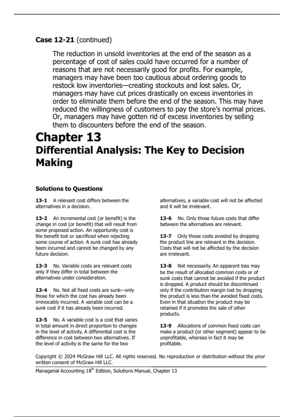 Managerial Accounting 18th Edition, Solutions Manual, Chapter 13