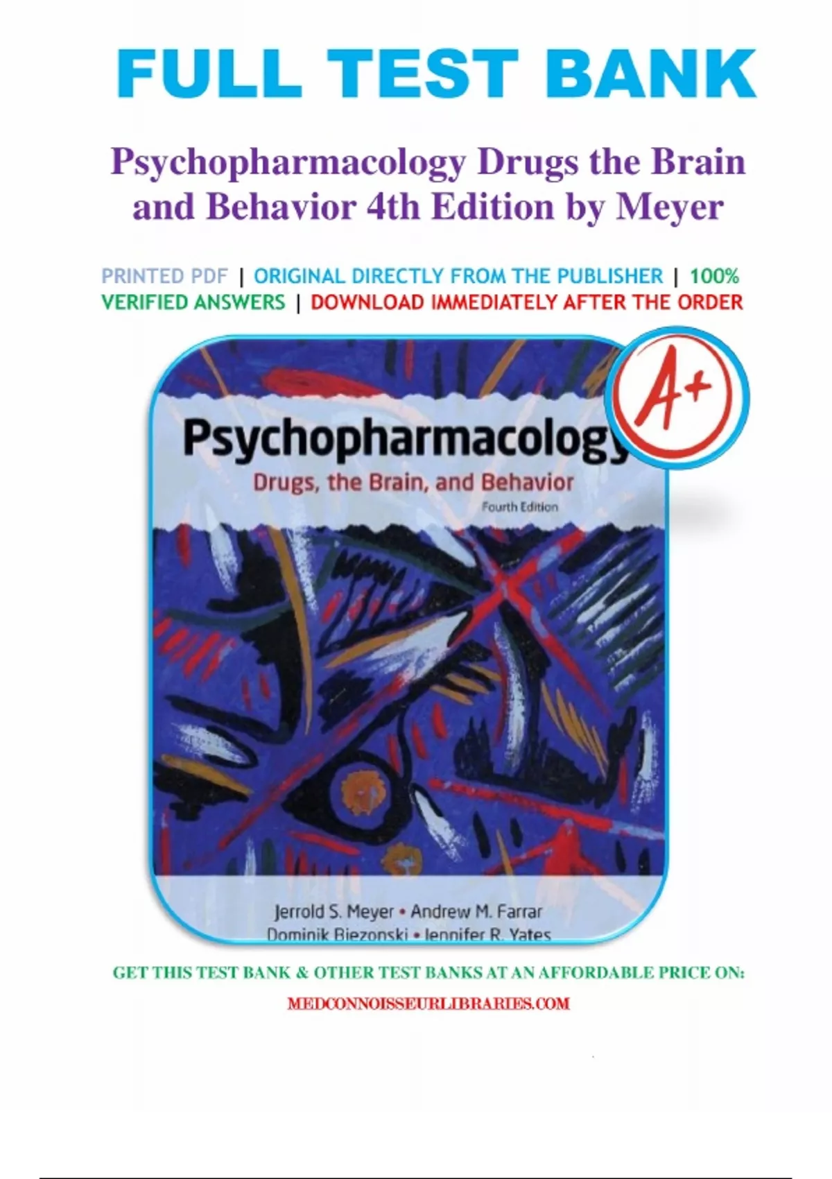 Test Bank For Psychopharmacology: Drugs, the Brain and Behavior 4th Edition By Meyer. Full Chapters Include;.....Chapter 1 Principles of Pharmacology Chapter 2 Structure and Function of the Nervous System Chapter 3 Chemical Signaling by Neurotransmitters and Hormones Chapter 4 Methods of Research in Psychopharmacology Chapter 5 Catecholamines Chapter 6 Serotonin Chapter 7 Acetylcholine Chapter 8 Glutamate and GABA Chapter 9 Drug Abuse and Addiction Chapter 10 Alcohol Chapter 11 The Opioids Chapter 12 Psychomotor Stimulants: Cocaine, Amphetamine, and Related Drugs Chapter 13 Nicotine and Caffeine Chapter 14 Marijuana and the Cannabinoids Chapter 15 Hallucinogens, PCP, and Ketamine Chapter 16 Inhalants, GHB, and Anabolic-Androgenic Steroids Chapter 17 Disorders of Anxiety and Impulsivity and the Drugs Used to Treat These Disorders Chapter 18 Affective Disorders: Antidepressants and Mood Stabilizers Chapter 19 Schizophrenia: Antipsychotic Drugs Chapter 20 Neurodegenerative Diseases