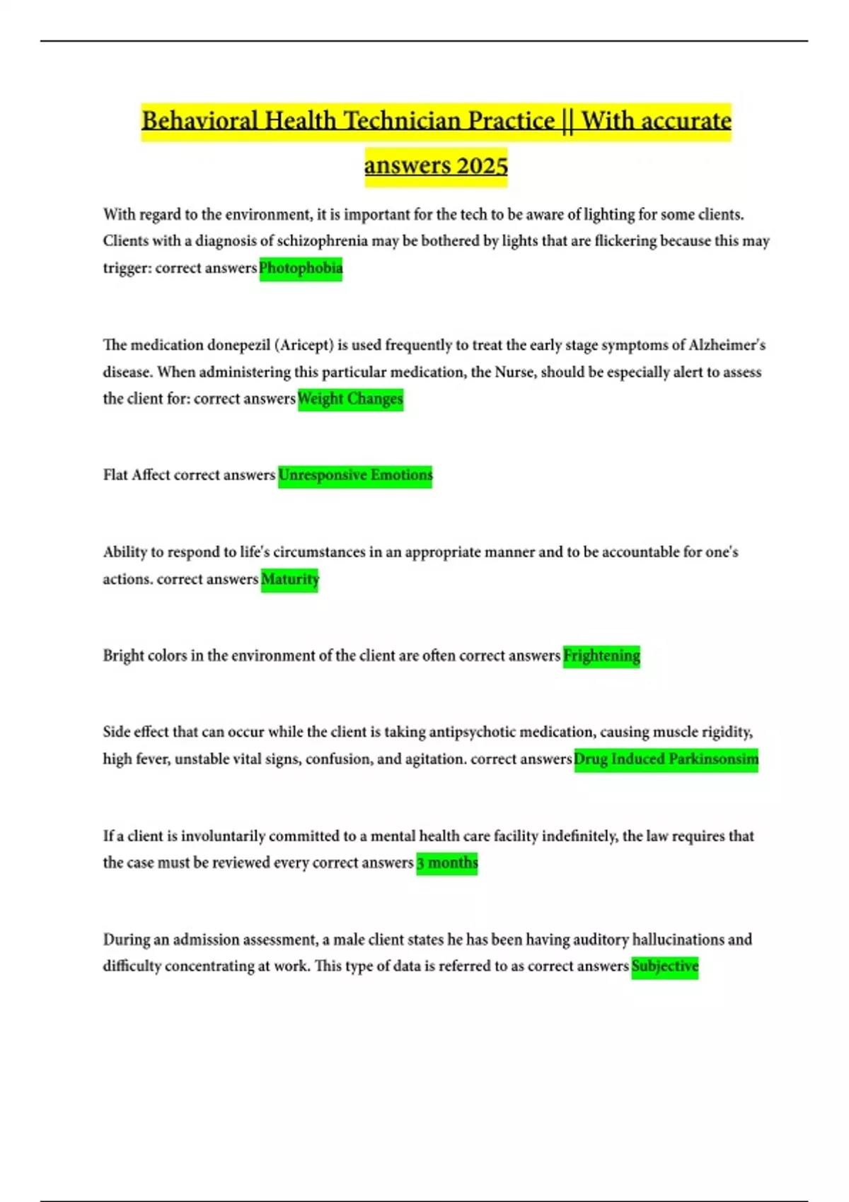 Behavioral Health Technician Practice || With accurate answers 2025.