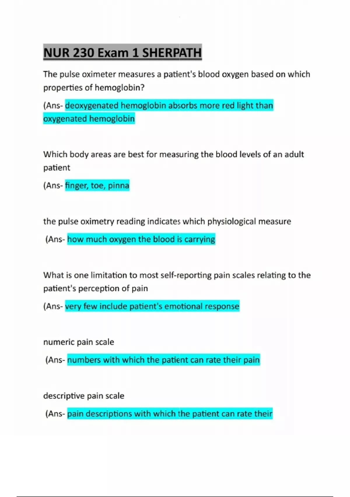 The pulse oximeter measures a patient's blood oxygen based on which properties of hemoglobin? (Ans- deoxygenated hemoglobin absorbs more red light than oxygenated hemoglobin Which body areas are best for measuring the blood levels of an adult patient (Ans- finger, toe, pinna the pulse oximetry reading indicates which physiological measure (Ans- how much oxygen the blood is carrying What is one limitation to most self-reporting pain scales relating to the patient's perception of pain (Ans- very few include patient's emotional response numeric pain scale (Ans- numbers with which the patient can rate their pain descriptive pain scale (Ans- pain descriptions with which the patient can rate theirbehavioral pain scale (Ans- allows the nurse to choose from pain behaviors to rate the pain of the patient and is not a self-reporting pain scale
