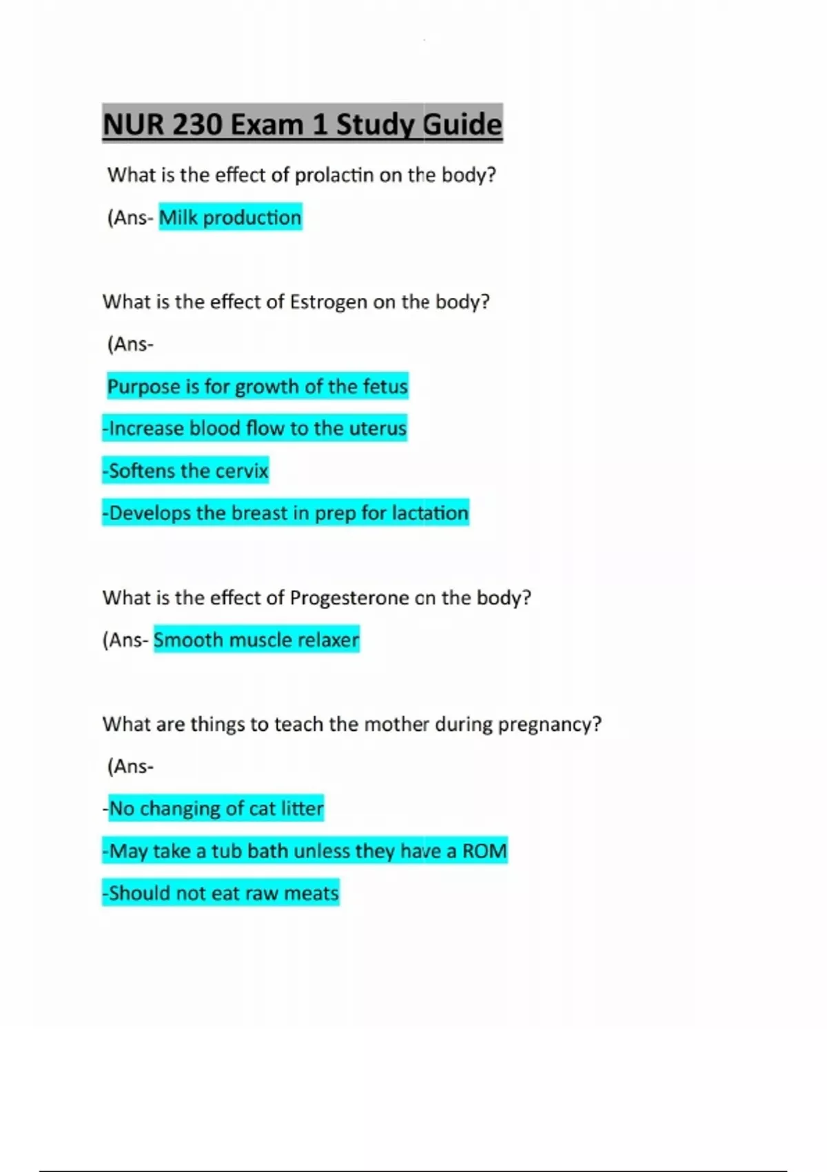 What is the effect of prolactin on the body? (Ans- Milk production What is the effect of Estrogen on the body? (AnsPurpose is for growth of the fetus -Increase blood flow to the uterus -Softens the cervix -Develops the breast in prep for lactation What is the effect of Progesterone on the body? (Ans- Smooth muscle relaxer What are things to teach the mother during pregnancy? (Ans- -No changing of cat litter -May take a tub bath unless they have a ROM -Should not eat raw meatsWhat is lightning? (Ans- The dropping of the baby into the pelvis, occurs at 36 weeks