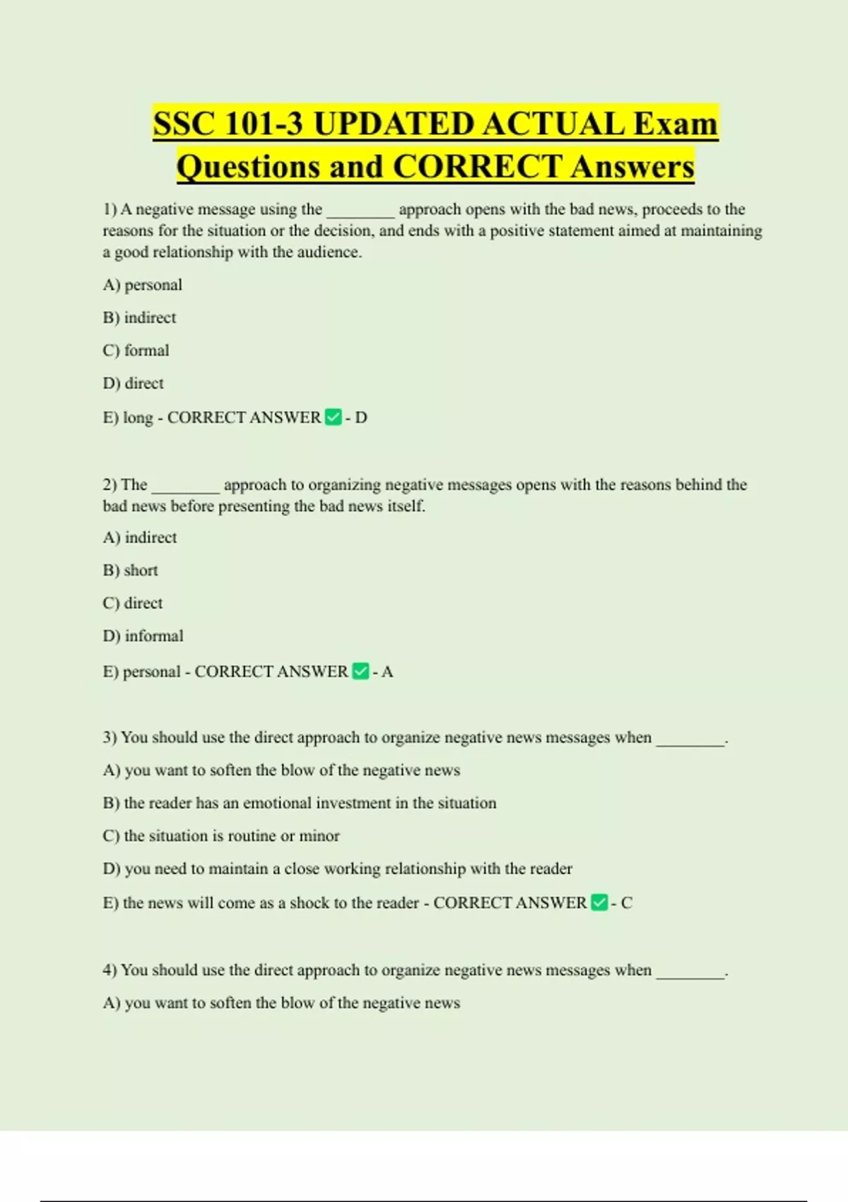 1) A negative message using the ________ approach opens with the bad news, proceeds to the