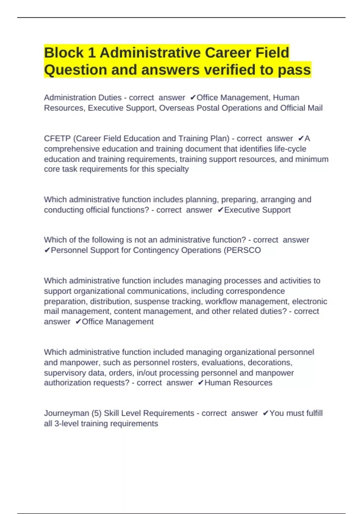 Block 1 Administrative Career Field Question and answers verified to pass Administration Duties - correct answer Office Management, Human Resources, Executive Support, Overseas Postal Operations and Official Mail CFETP (Career Field Education and Training Plan) - correct answer A comprehensive education and training document that identifies life-cycle education and training requirements, training support resources, and minimum core task requirements for this specialty Which administrative function includes planning, preparing, arranging and conducting official functions? - correct answer Executive Support Which of the following is not an administrative function? - correct answer Personnel Support for Contingency Operations (PERSCO Which administrative function includes managing processes and activities to support organizational communications, including correspondence preparation, distribution, suspense tracking, workflow management, electronic mail management, content management, and other related duties? - correct answer Office Management Which administrative function included managing organizational personnel and manpower, such as personnel rosters, evaluations, decorations, supervisory data, orders, in/out processing personnel and manpower authorization requests? -