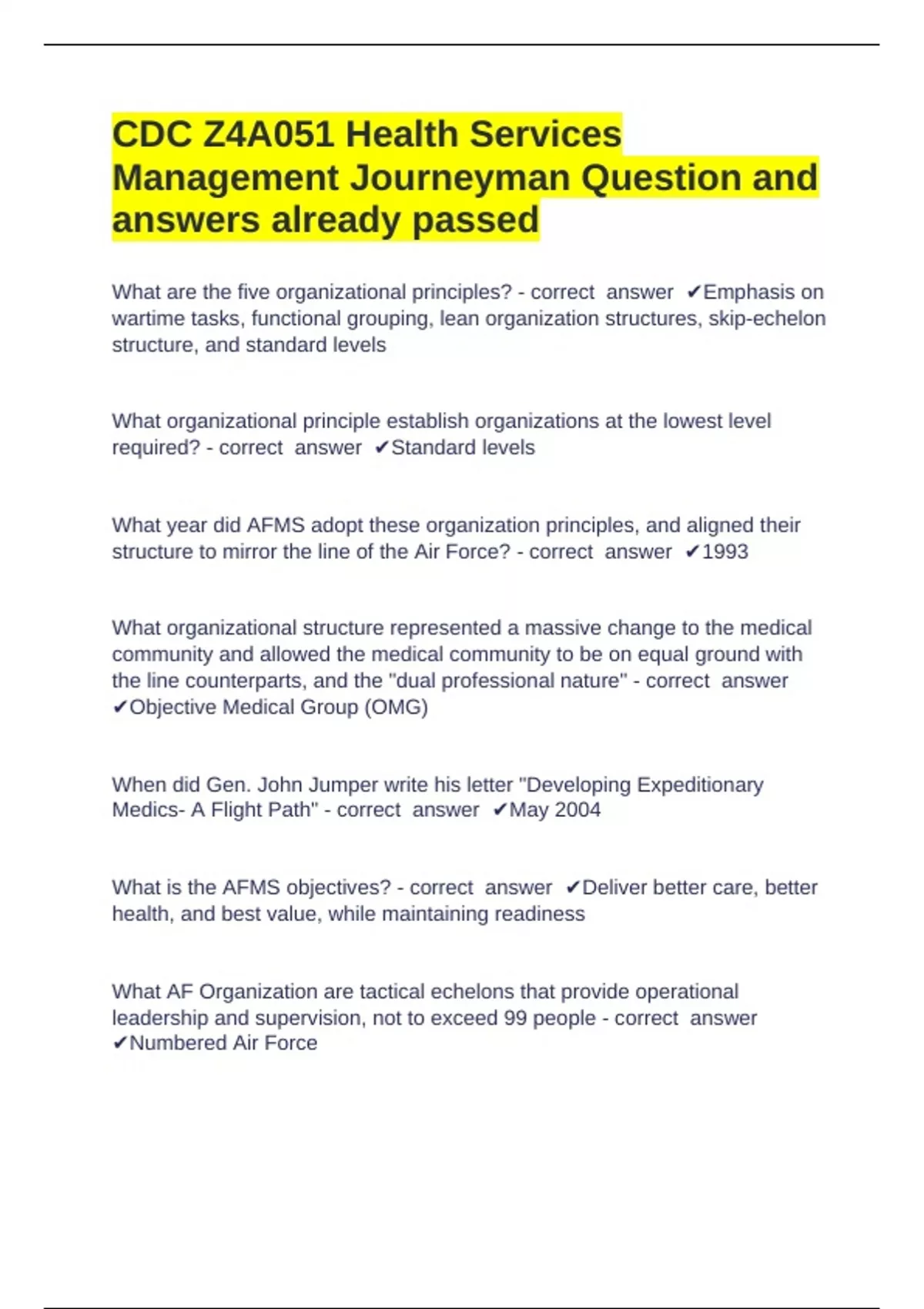 CDC Z4A051 Health Services Management Journeyman Question and answers already passed What are the five organizational principles? - correct answer Emphasis on wartime tasks, functional grouping, lean organization structures, skip-echelon structure, and standard levels What organizational principle establish organizations at the lowest level required? - correct answer Standard levels What year did AFMS adopt these organization principles, and aligned their structure to mirror the line of the Air Force? - correct answer 1993 What organizational structure represented a massive change to the medical community and allowed the medical community to be on equal ground with the line counterparts, and the "dual professional nature" - correct answer Objective Medical Group (OMG) When did Gen. John Jumper write his letter "Developing Expeditionary Medics- A Flight Path" - correct answer May 2004 What is the AFMS objectives? - correct answer Deliver better care, better health, and bes