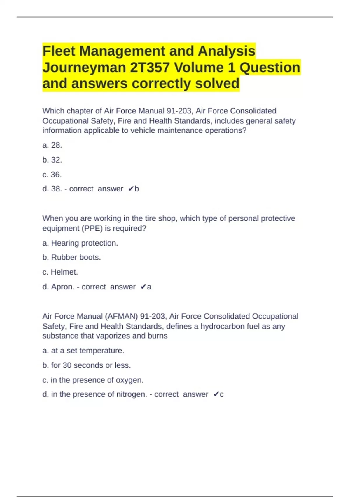 Fleet Management and Analysis Journeyman 2T357 Volume 1 Question and answers correctly solved Which chapter of Air Force Manual 91-203, Air Force Consolidated Occupational Safety, Fire and Health Standards, includes general safety information applicable to vehicle maintenance operations? a. 28. b. 32. c. 36. d. 38. - correct answer b When you are working in the tire shop, which type of personal protective equipment (PPE) is required? a. Hearing protection. b. Rubber boots. c. Helmet. d. Apron. - correct answer a Air Force Manual (AFMAN) 91-203, Air Force Consolidated Occupational Safety, Fire and Health Standards, defines a hydrocarbon fuel as any substance that vaporizes and burns a. at a set temperature. b. for 30 seconds or less. c. in the presence of oxygen. d. in the presence of nitrogen. - correct answer c Which kind of gas is